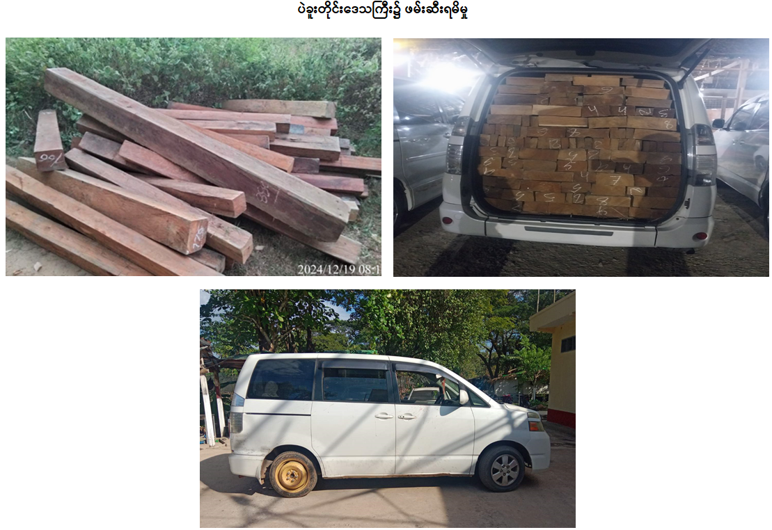 ၃။ ထို့အတူ ရန်ကုန်တိုင်းဒေသကြီး တရားမဝင်ကုန်သွယ်မှုတိုက်ဖျက်ရေးအထူးအဖွဲ့၏ စီမံခန့်ခွဲမှုဖြင့် တာဝန်ကျပူးပေါင်းအဖွဲ့များက စစ်ဆေးမှုများ ဆောင်ရွက်ခဲ့ရာ ထန်းတပင်မြို့နယ်၊ အမှတ် (၅) လမ်းမကြီးအနီး၌ လိုင်စင်မဲ့ Nissan X-Trail မော်တော်ယာဉ် (၁) စီး (ခန့်မှန်းတန်ဖိုးငွေကျပ် ၄,၅၀၀,၀၀၀) ညကို ပို့ကုန်သွင်းကုန်ဥပဒေအရလည်းကောင်း၊ သန်လျင်မြို့နယ်၊ သီလဝါလမ်းနှင့် အမှတ် (၆) လမ်းထောင့်၌ မော်တော်ယာဉ် (၁) စီးပေါ်မှ တရားမဝင် ကျွန်းသစ် (၀.၅၂၁) တန် (ခန့်မှန်းတန်ဖိုးငွေကျပ် ၄၅၈,၀၀၀) နှင့် အဆိုပါပစ္စည်းများ တင်ဆောင်လာသည့် Toyota Lite Ace မော်တော်ယာဉ် (၁) စီး (ခန့်မှန်းတန်ဖိုးငွေကျပ် ၁၉,၅၀၀,၀၀၀)ကို သစ်တောဥပဒေအရလည်းကောင်း၊ စုစုပေါင်း (ခန့်မှန်းတန်ဖိုးငွေကျပ် ၂၄,၄၅၈,ဝဝဝ)ကို ဖမ်းဆီးအရေးယူဆောင်ရွက်လျက်ရှိပါသည်။
