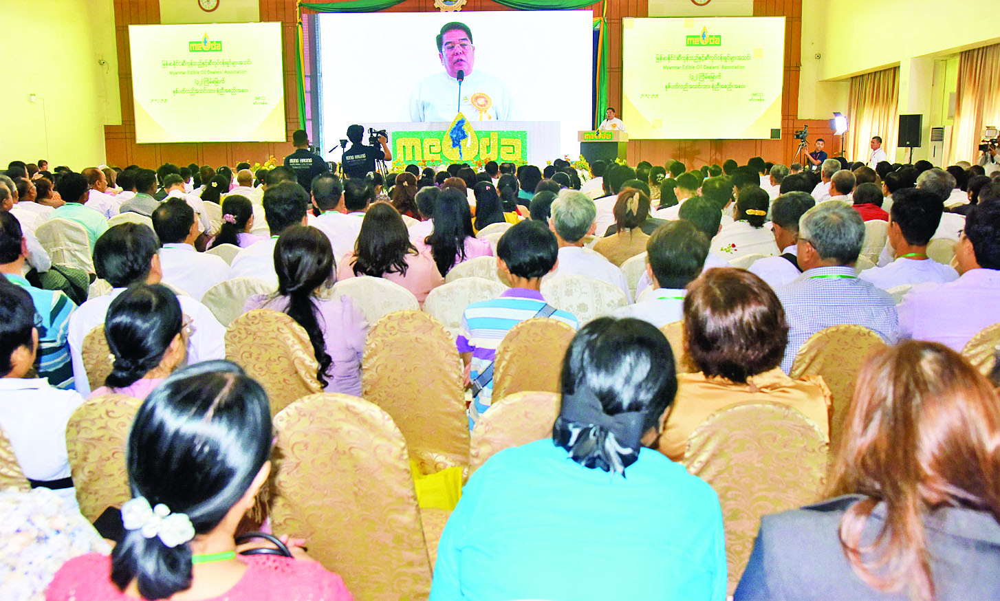 (၃၂) ကြိမ်မြောက် မြန်မာနိုင်ငံဆီကုန်သည်နှင့် ဆီလုပ်ငန်းရှင်များအသင်း၏ နှစ်ပတ်လည် အသင်းသားစုံညီအစည်းအဝေးတွင် ပြခန်းပေါင်း ၁၅ ခန်း ပါဝင်ပြသခဲ့ရာ တိုင်းဒေသကြီး စီးပွားရေးရာဝန်ကြီး၊ မြန်မာနိုင်ငံဆီကုန်သည်နှင့် ဆီလုပ်ငန်းရှင်များအသင်းဥက္ကဋ္ဌနှင့် တာဝန်ရှိသူများက ပြခန်းများကို လှည့်လည်ကြည့်ရှုကြသည်။