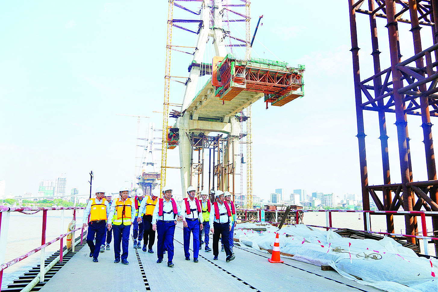 ဆက်လက်၍ ဒလဘက်ခြမ်းရှိ ပင်မတံတားရေလယ်တာဝါတိုင် (Pylon-1) သို့ ရေယာဉ်ဖြင့်သွားရောက်၍ လုပ်ငန်းဆောင်ရွက်နေမှုအခြေအနေတို့ကို အသေးစိတ်လိုက်လံကြည့်ရှုစစ်ဆေးပြီး လုပ်ငန်းများအားလုံး သတ်မှတ်ချိန်အမီပြီးစီးရေး တည်ဆောက်သွားရန်တို့ကို မှာကြားသည်။