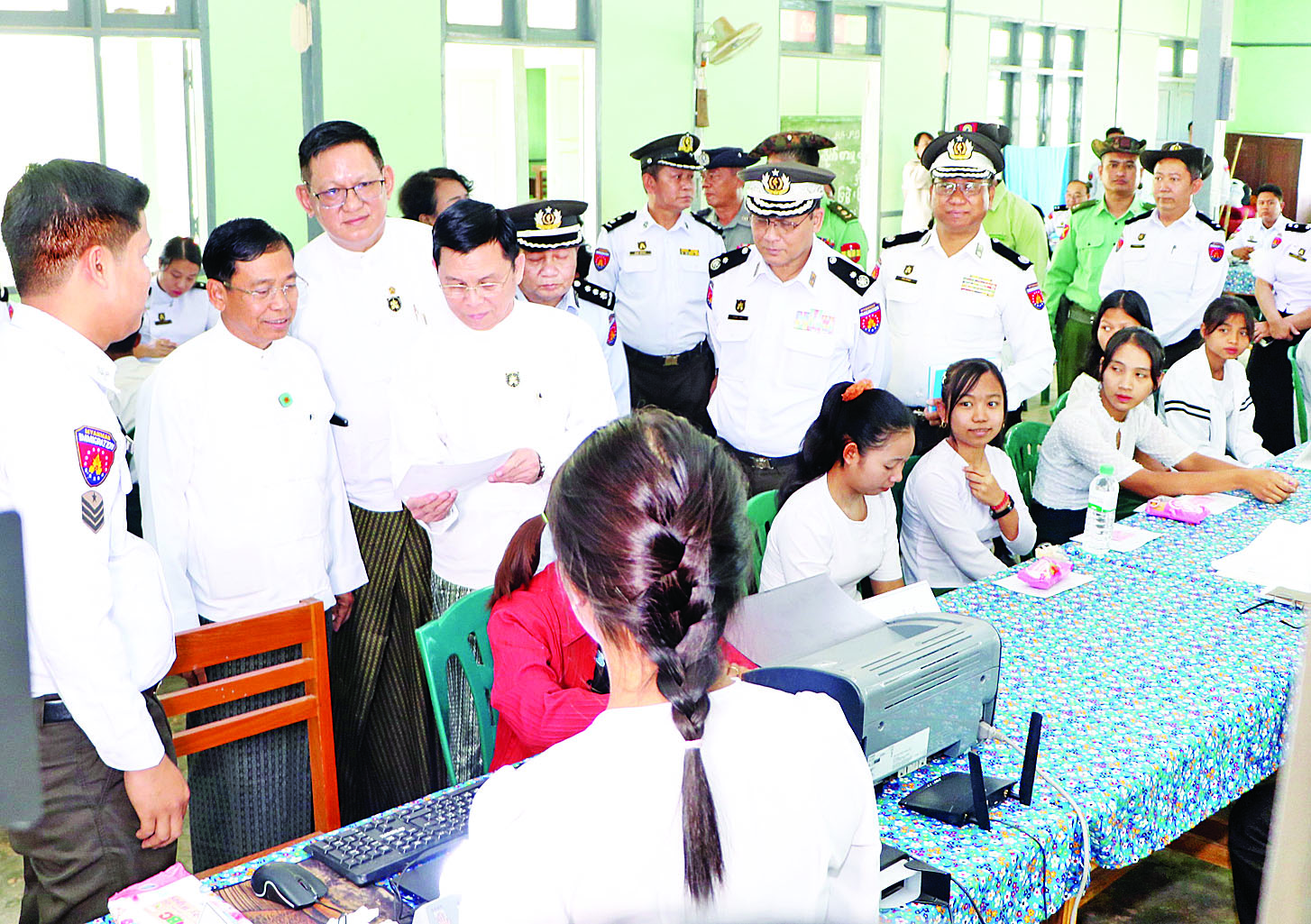 ဆက်လက်၍ ပြည်ထောင်စုဝန်ကြီး၊ နေပြည်တော်ကောင်စီဥက္ကဋ္ဌနှင့်အဖွဲ့သည် လူဝင်မှုကြီးကြပ်ရေးနှင့် ပြည်သူ့အင်အားဝန်ကြီးဌာန လယ်ဝေးမြို့နယ်ဦးစီးမှူးရုံးသို့ သွားရောက်၍ ဝန်ထမ်းများက မြို့နယ်အတွင်းရှိ ရပ်ကွက်နှင့်ကျေးရွာများမှ ဒေသခံပြည်သူများအား ပန်းခင်းစီမံချက်အဆင့် (၃) ဖြင့် အိမ်ထောင်စုလူဦးရေစာရင်းနှင့် နိုင်ငံသားစိစစ်ရေးကတ် စိစစ်ထုတ်ပေးခြင်းနှင့် e-ID စနစ်ဖြင့် ကိုယ်ရေးအချက်အလက် (Biographic) နှင့် ဇီဝဆိုင်ရာအချက်အလက် (Biometric) ကောက်ယူကာ ဂဏန်း (၁၀) လုံးပါ Unique ID နံပါတ်ထုတ်ပေးခြင်းလုပ်ငန်းကို လုပ်ငန်းစဉ် အဆင့်ဆင့်ဖြင့် One Stop Service စိစစ် ဆောင်ရွက်ထုတ်ပေးနေမှုကို ကြည့်ရှုအားပေးသည်။