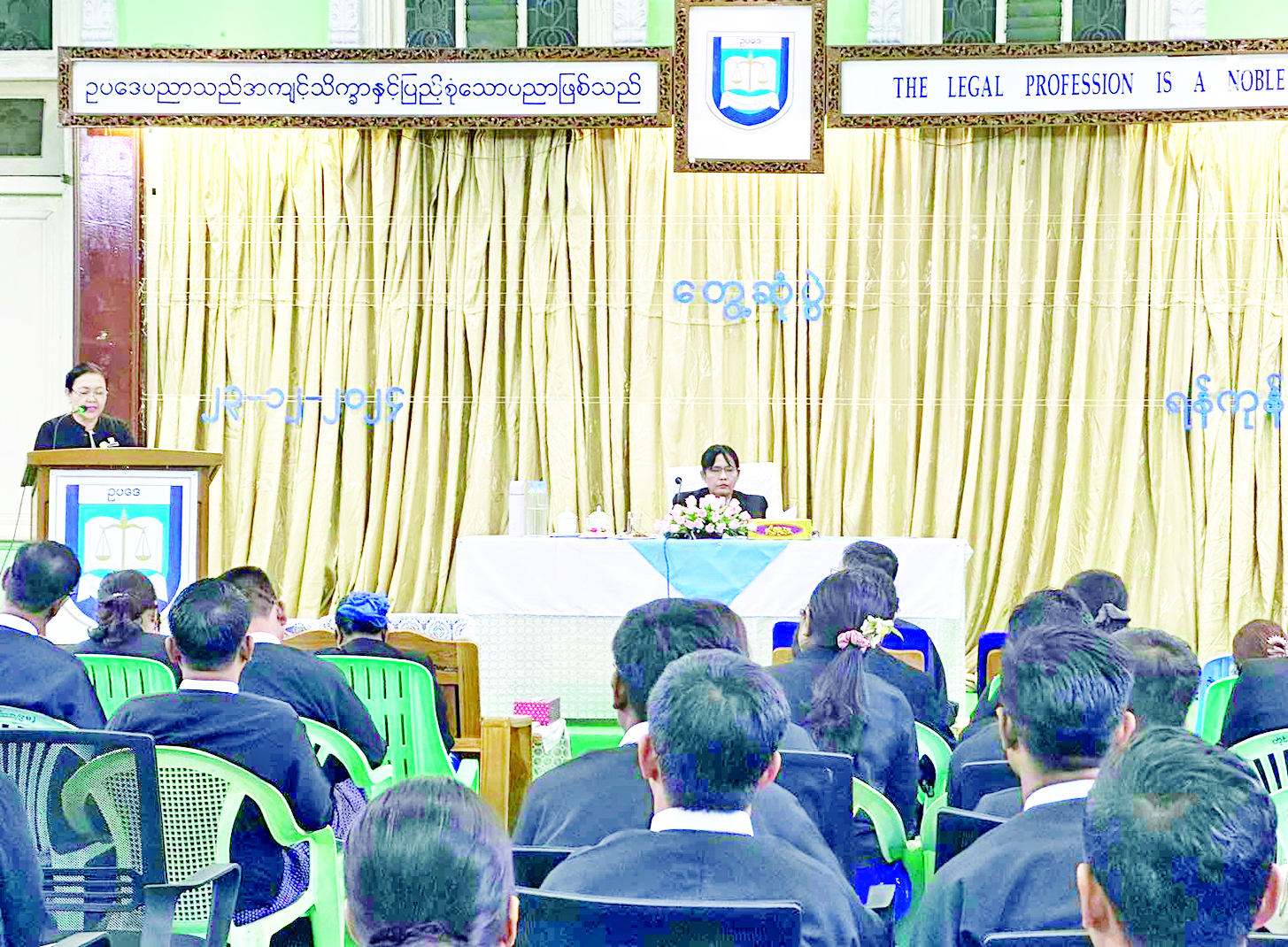 တရားမအမှုလိုက်(လက်တွေ့) ဘာသာရပ်သင်တန်းဖွင့်ပွဲနှင့် ဥပဒေရေးရာဝန်ကြီးဌာန ပြည်ထောင်စုဝန်ကြီးနှင့် ပြည်ထောင်စုရှေ့နေချုပ်နှင့် ရန်ကုန်တိုင်းဒေသကြီးအတွင်းရှိ ဥပဒေအရာရှိများ တွေ့ဆုံပွဲ အခမ်းအနားကို ယနေ့နံနက် ၁၁ နာရီတွင် ရန်ကုန်တိုင်းဒေသကြီး ဥပဒေချုပ်ရုံး မြေညီထပ်ရှိ အစည်းအဝေးခန်းမ၌ ကျင်းပသည်။