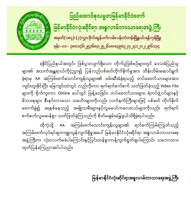ရခိုင်ပြည်နယ်အတွင်း ဖြစ်ပွားလျက်ရှိသော တိုက်ပွဲဖြစ်စဉ်များ၌ ဒေသခံပြည်သူများ၏ အသက်အန္တရာယ်ကိုငဲ့ညှာ၍ ပြန်လည်ပစ်ခတ်တိုက်ခိုက်မှုအား ထိန်းသိမ်းဆောင်ရွက်ခဲ့ရသဖြင့် ဖမ်းဆီးခြင်းခံခဲ့ရသည့် တပ်မတော်သားများအား AA အကြမ်းဖက်သောင်းကျန်းသူများက ကျင်းတူးခိုင်းပြီး မြေကျင်းထဲသို့ထည့်၍ လည်လှီးကာသတ်ဖြတ်ခြင်း၊ အဆိုပါလည်လှီးသတ်ဖြတ်နေသည့် Video File များကို ရိုက်ကူး၍ Online ပေါ်တွင် ဖြန့်ဝေခြင်း ပြုလုပ်လျက်ရှိသည်။ ထို့ပြင် ကျောက်တော်နယ်မြေ၌လည်း တပ်မတော်သားများ ရဲတပ်ဖွဲ့ဝင်များနှင့် မိသားစုများလိုက်ပါလာသော သင်္ဘောကိုလည်း ပစ်ခတ်ဖောက်ခွဲ၍ ရေနစ်နေသည့် အမျိုးသမီးများနှင့် ကလေးငယ်များကိုလည်း ရက်ရက်စက်စက် သတ်ဖြတ်ခဲ့ကြသည်။