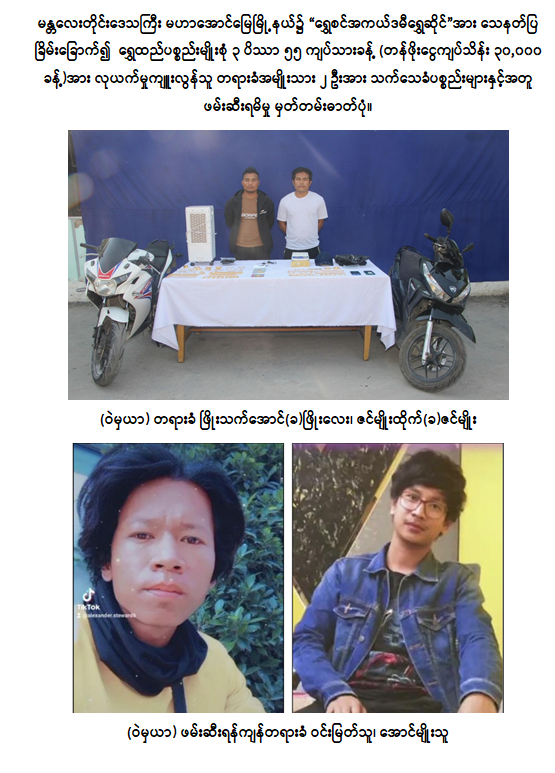 ၂၀၂၄ ခုနှစ်၊ ဒီဇင်ဘာလ ၁၈ ရက်နေ့ ညနေ ၅ နာရီခွဲတွင် မန္တလေးတိုင်းဒေသကြီး၊ မဟာအောင်မြေမြို့နယ်၊ ဟေမမာလာမြောက်ရပ်ကွက်၊ ၇၇ လမ်း၊ ၃၆ လမ်းနှင့် ၃၇ လမ်းကြားရှိ “ရွှေစင်အကယ်ဒမီရွှေဆိုင်”၌ ရွှေဆိုင်ပိုင်ရှင် ဒေါ်ဝင်းဝင်းအေး (၅၂) နှစ်သည် ဆိုင်ပိတ်ပြီး ဆိုင်အတွင်း အရောင်းဝန်ထမ်းများနှင့်အတူ ရှိနေစဉ် နံပါတ်မပါ Click အနက်ရောင်ဆိုင်ကယ် ၁ စီးဖြင့် Mask များတပ်ဆင်ထားသည့် အမျိုးသား ၃ ဦး (စိစစ်ဆဲ) ရောက်ရှိလာပြီး ၁ ဦးမှာ ဆိုင်ပေါက်ဝတွင် စောင့်နေကာ ပစ္စတိုသေနတ်ကိုယ်စီ ကိုင်ဆောင်ထားသည့် အမျိုးသား ၂ ဦးမှာ ဆိုင်အတွင်းသို့ ဝင်ရောက်၍ သေနတ်ပြခြိမ်းခြောက်ပြီး ကောင်တာဘေးစားပွဲပေါ်တွင် တင်ထားသော ရွှေထည်အတုံး/ ဆွဲကြိုး/ လက်ကောက်ထည့်ထားသည့် ပလတ်စတစ်ပုံး ၃ ပုံးအတွင်းမှ ရွှေထည်ပစ္စည်းမျိုးစုံ စုစုပေါင်းရွှေအလေးချိန် ၃ ပိဿာ ၅၅ ကျပ်သားခန့် (တန်ဖိုးငွေကျပ်သိန်း ၃၀,၀၀၀ ခန့်) အား လုယက်ယူဆောင်ထွက်ပြေးသွားကြောင်း သတင်းအရ လုံခြုံရေးတပ်ဖွဲ့ဝင်များက ပြစ်မှုကျူးလွန်သူများအား ဖော်ထုတ်ဖမ်းဆီးရမိနိုင်ရေး မဟာအောင်မြေမြို့မရဲစခန်း (ပ) ၃၃၀/၂၀၂၄၊ ရာဇသတ်ကြီးပုဒ်မ ၃၉၂ ဖြင့် အမှုရေးဖွင့်စုံစမ်းဆောင်ရွက်ခဲ့သည်။