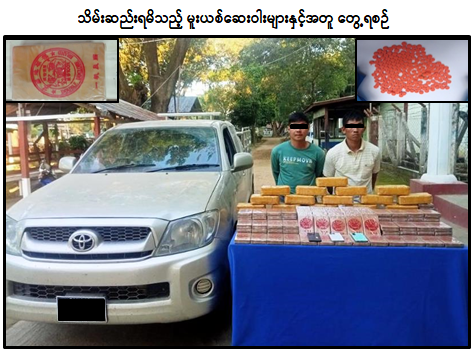 မူးယစ်ဆေးဝါးတားဆီးနှိမ်နင်းရေးရဲတပ်ဖွဲ့မှ တပ်ဖွဲ့ဝင်များ ပါဝင်သော ပူးပေါင်းအဖွဲ့သည် ၂၀၂၄ ခုနှစ်၊ ဒီဇင်ဘာလ ၂၈ ရက်နေ့ နံနက် ၁၁ နာရီခွဲအချိန် ရှမ်းပြည်နယ် (တောင်ပိုင်း)၊ မိုင်းပန်မြို့နယ်၊ တာဆန်းကျေးရွာအနီးတွင် မိုင်းပန်မြို့ဘက်မှ မိုင်းတုံမြို့ဘက်သို့ စိုင်းနွံဟန် (ခ) စိုင်းနွံလျန် မောင်းနှင်ပြီး စိုင်းစံညွန့် လိုက်ပါလာသည့် VIGO မော်တော်ယာဉ်ကို သတင်းအရရှာဖွေရာ ယာဉ်၏ ကြမ်းခင်းအံဝှက်အတွင်း သိုဝှက်သယ်ဆောင်လာသည့် ဒေသကာလတန်ဖိုးငွေကျပ် သိန်း ၅,၄၀၀ ကျော်တန်ဖိုးရှိ ဘိန်းဖြူဘလောက်တုံး ၁၂၀ တုံး၊ အလေးချိန် ၄၀ ဒသမ ၂ ကီလိုနှင့် စိတ်ကြွရူးသွပ်ဆေးပြား ၂ သိန်းတို့အား သိမ်းဆည်းရမိခဲ့ပြီး စစ်ဆေးဖော်ထုတ်ချက်အရ သိမ်းဆည်းရမိမူးယစ်ဆေးဝါးများအား နမ့်စန်မြို့နယ်မှ မိုင်းတုံမြို့နယ်သို့ သယ်ဆောင်ရောင်းဝယ်ခြင်းဖြစ်ကြောင်း သိရှိရသဖြင့် ၎င်းတို့အား ဥပဒေအရ အရေးယူထားရှိပြီး ကွင်းဆက်ပြစ်မှုကျူးလွန်သူများအား ဆက်လက်စစ်ဆေးဖော်ထုတ်လျက်ရှိကြောင်း မြန်မာနိုင်ငံရဲတပ်ဖွဲ့မှ သတင်းရရှိသည်။