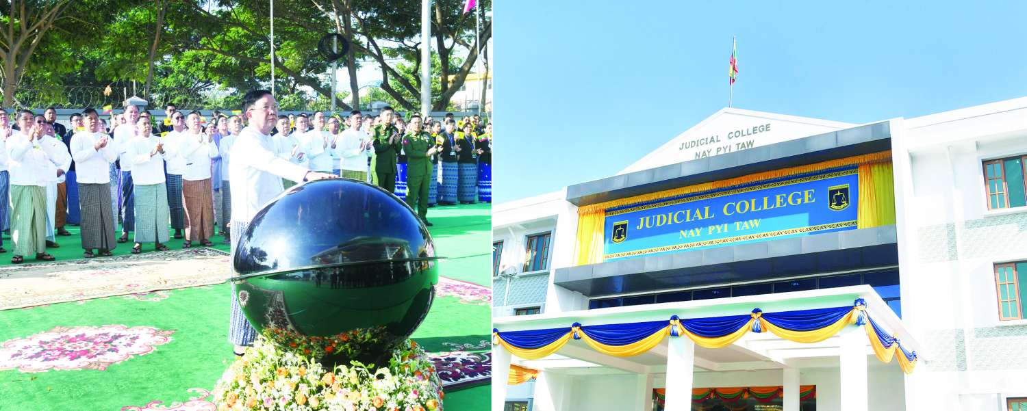 ဦးစွာ ပြည်ထောင်စုတရားသူကြီးချုပ် ဦးသာဌေး၊ နိုင်ငံတော်ဖွဲ့စည်းပုံ အခြေခံဥပဒေဆိုင်ရာခုံရုံးဥက္ကဋ္ဌ ဦးအောင်ဇော်သိန်းနှင့် ဆောက်လုပ်ရေးဝန်ကြီးဌာန ပြည်ထောင်စုဝန်ကြီး ဦးမျိုးသန့်တို့က Judicial College အဆောက်အဦအသစ်အား ဖဲကြိုးဖြတ်ဖွင့်လှစ်ပေးသည်။