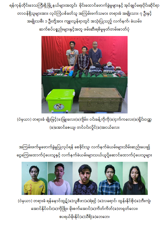 ဖြစ်စဉ်တွင် ရန်ကုန်တိုင်းဒေသကြီးရှိ မြို့နယ်များအတွင်း မိုင်းထောင်ဖောက်ခွဲတိုက်ခိုက်မှုနှင့် အကြမ်းဖက်လုပ်ကြံပစ်ခတ်မှုများ ကျူးလွန်ခဲ့သူများဖြစ်ကြသည့် ရန်နောင်ထွဋ်(ခ) လူစီဖာ(ခ) ရဲရင့်(ခ) လရောင်၊ ထွန်းနိုင်စိုး(ခ) ဘီးကျဲ၊ မိုးစက်အောင်(ခ) ကိတ်ကိတ်(ခ) တရုတ်လေး၊ အောင်နိုင်ဝင်း(ခ) ကိုဖြိုး၊ ဧပရယ်မိုးနိုင်(ခ) သီရိ(ခ) ဘေဘေ၊ ဝင်းခန့်ကိုကို(ခ) ငှက်ကလေး(ခ) ရှိုင်းဝဏ္ဏ(ခ) အောင်ဇေယျ၊ တင်ဝင်းလှိုင်(ခ)အငယ်လေးနှင့် မျိုးမြင့်(ခ) ခြူးလေး(ခ) ဂျိမ်းတို့ ၈ ဦးအား ပြစ်မှုများကျူးလွန်စဉ် အသုံးပြုခဲ့သည့် မော်တော်ယာဉ် ၂ စီး၊ လက်နက်မျိုးစုံ ၆ လက်နှင့် ခဲယမ်းများ၊ အကြမ်းဖက်ဖောက်ခွဲမှုနှင့် လက်လုပ်ရှော့တိုက်ဒုံးများပြုလုပ်ရန် ပြင်ဆင်ထားသည့် ဆက်စပ်ပစ္စည်းများနှင့်အတူ ဖမ်းဆီးရမိခဲ့ပြီး ၎င်းတို့ ကျူးလွန်ခဲ့သော ပြစ်မှုများအတိုင်း ထိရောက်စွာအရေးယူနိုင်ရေး ဥပဒေနှင့်အညီ ဆက်လက်ဆောင်ရွက်သွားမည်ဖြစ်ကာ အကြမ်းဖက်မှုပြုလုပ်နေသူများအား ပြည်သူတစ်ရပ်လုံးက ဝိုင်းဝန်းကာကွယ်တိုက်ဖျက်ကြရန်နှင့် ဖမ်းဆီးရန်ကျန်တရားခံများအား အမြန်ဆုံးဆက်လက်ဖမ်းဆီးရမိရေးအတွက် ၎င်းတို့ပုန်းခိုရာနေရာများ၊ လှုပ်ရှားသွားလာနေထိုင်မှု သတင်းများရရှိပါက သက်ဆိုင်ရာသို့ လျှို့ဝှက်စွာ သတင်းပေးတိုင်ကြားနိုင်ပါကြောင်းနှင့် မြို့၊ ရွာများ အမြန်ဆုံးအေးချမ်းတည်ငြိမ်ရေးအတွက် ပြည်သူတစ်ရပ်လုံး ပူးပေါင်းပါဝင်ကြိုးပမ်းဆောင်ရွက်နိုင်ပါရန် မေတ္တာရပ်ခံအပ်ပါကြောင်း အသိပေးသတင်းထုတ်ပြန်အပ်ပါသည်။