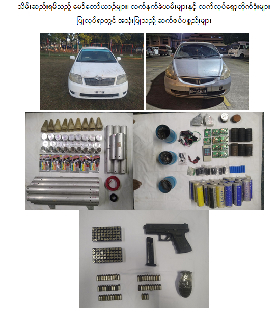 ဖမ်းဆီးရမိတရားခံ ဝင်းခန့်ကိုကို(ခ) ငှက်ကလေး(ခ) ရှိုင်းဝဏ္ဏ(ခ) အောင်ဇေယျ၏ ထွက်ဆိုချက်အရ ၎င်းတို့အကြမ်းဖက်အဖွဲ့ဝင်ဖြစ်သည့် မင်းစံ(ခ) မျိုးဦး(ဖမ်းမမိ) နေထိုင်သည့် လှိုင်သာယာ(အနောက်ပိုင်း) မြို့နယ်၊ အမှတ်(၉)ရပ်ကွက်၊ ချောင်းဦးလမ်း၊ အမှတ်(၃၃၃/က)နေအိမ်မှ အနက်ရောင် ၇၉ ဗုံးပစ်လောင်ချာ ၂ လက်၊ အနက်ရောင် M 16 မောင်းပြန်ရိုင်ဖယ် သေနတ် ၁ လက်၊ ၎င်းကျည်အိမ် ၁ ခု၊ ၄ဝ မမကျည် ၅ တောင့်၊ လက်လုပ်ဗုံးပြုလုပ်ရာတွင် အသုံးပြုသည့် ဆားကစ်ပြား ၅ဝဝ ခု၊ နီ/နက်အရောင် အဖွင့်အပိတ်ခလုတ် ၁ဝဝ ခု၊ Panasonic စာတမ်းပါ ဓာတ်ခဲခြောက် ၁ဝ လုံးစီပါ စက္ကူဖာ ၃ဝ ဖာ၊ PVC စာတမ်းပါ ဝါယာကြိုးခွေ ၅ ခွေ၊ ဝါယာကြိုးပါ ဓာတ်ခဲခြောက်နှင့်တွဲသည့် ကတ်သီး ၃ဝဝ ခု၊ ဒီတိုနေတာ ၂ဝ ချောင်း၊ ယမ်းကြိုးခွေ ၁ ခွေ၊ မီတာထောက်ကိရိယာ ၂ ခု၊ ကော်အရည်ဖျော် Gun ၁ ခု၊ Remote မျိုးစုံ ၃ ခု၊ အပြာရောင် PVC ပိုက်ဖြင့် ပြုလုပ်ထားသော လက်လုပ်ဗုံး ၁ လုံး၊ Keypad ဖုန်း ၂ လုံး၊ ဓာတ်ခဲအားသွင်းစက် ၁ ခု၊ ဘက်ထရီစက်ဘီးအားသွင်းကြိုး ၁ စုံ၊ သံပိုက်ဖြင့် ပြုလုပ်ထားသာ လက်လုပ်ဗုံး ၂ လုံး၊ လက်လုပ်ဗုံးပြုလုပ်ရာတွင် အသုံးပြုသည့် သံတိုသံစ ၁ ဖာ၊ မီးတိပ်မျိုးစုံ ၁၇ ခွေ၊ 9 mm Thai Arms ပစ္စတိုကျည် ၉၆ တောင့်၊ 380 Auto USA -A ပစ္စတိုကျည် ၄၈ တောင့်၊ 380 Auto Thai Arms ပစ္စတိုကျည် ၁၃ တောင့်တို့ကိုလည်းကောင်း သိမ်းဆည်းရမိခဲ့ပါသည်။