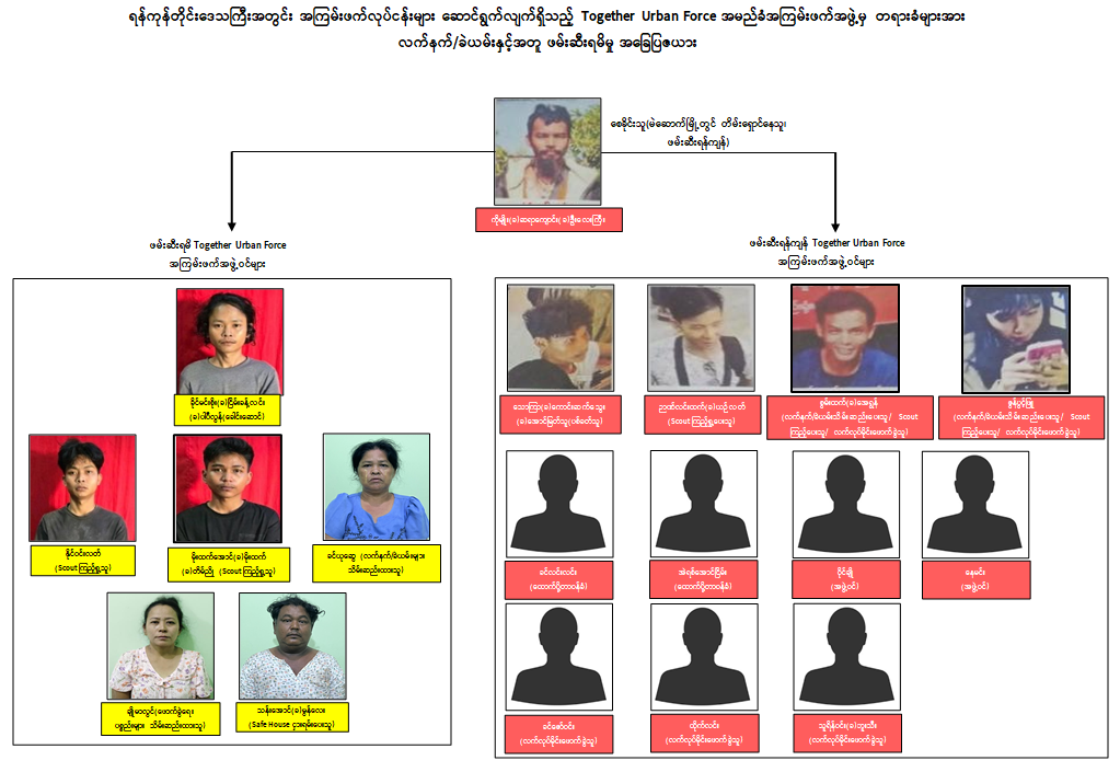 Together Urban Force အမည်ခံအကြမ်းဖက်အဖွဲ့သည် ကိုမျိုး(ခ)ဆရာကျောင်း(ခ)ဦးလေးကြီး၏ ခိုင်းစေမှုဖြင့် နိုင်ငံတော်၏ အုပ်ချုပ်မှုယန္တရားပျက်ပြားစေရန်နှင့် အပြစ်မဲ့ပြည်သူများ ထိတ်လန့်မှုဖြစ်စေရန် ရည်ရွယ်၍ အများပြည်သူနှင့် သက်ဆိုင်သောနေရာများတွင် အကြမ်းဖက်ဖောက်ခွဲမှု ၆ ကြိမ်၊ အကြောင်းမဲ့လုပ်ကြံသတ်ဖြတ်မှု ၂ ကြိမ် ဆောင်ရွက်ခဲ့ကြောင်း ဖော်ထုတ်သိရှိရသည်-