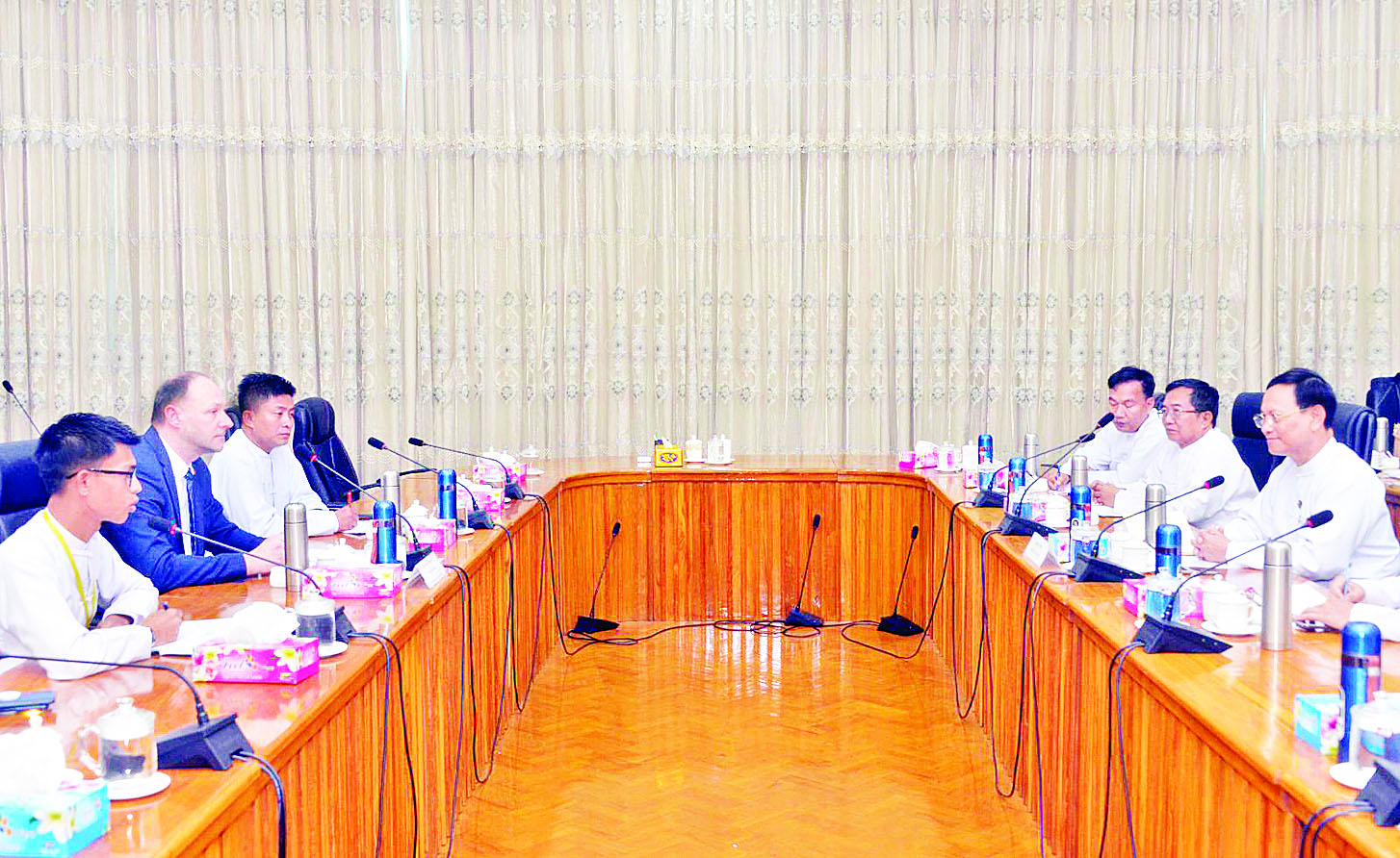ပညာရေးဝန်ကြီးဌာန ဒုတိယဝန်ကြီး ဒေါက်တာဇော်မြင့်သည် Belarusan State University ၏ First Vice-Rector ဖြစ်သူ Dr Dzmitry Kurlavich ကို ယနေ့ ညနေပိုင်းတွင် ပညာရေးဝန်ကြီးဌာန ရုံးအမှတ် (၁၃) ရှိ အစည်းအဝေးခန်းမ၌တွေ့ဆုံရာ ပါမောက္ခချုပ်များ၊ ဒုတိယပါမောက္ခချုပ်များ တက်ရောက်သည်။