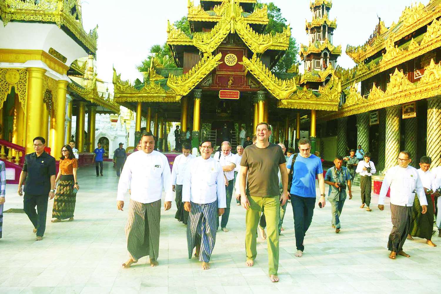ယင်းနောက် ဗဟန်းမြို့နယ်ရှိ ရွှေတိဂုံစေတီတော်မြတ်ကြီးသို့ သွားရောက်ပြီး ရန်ကုန်တိုင်းဒေသကြီး ဝန်ကြီးချုပ်ဦးစိုးသိန်း၊ ဘဏ္ဍာတော်ထိန်းဂေါပကအဖွဲ့များနှင့်အတူ စေတီတော်မြတ်ကြီးအား ဖူးမြော်ကြည်ညိုကြပြီး စေတီတော်သမိုင်းအချက်အလက်နှင့် ဘုရားဖူးလမ်းညွှန်တို့ကို ကြည့်ရှုလေ့လာကြသည်။