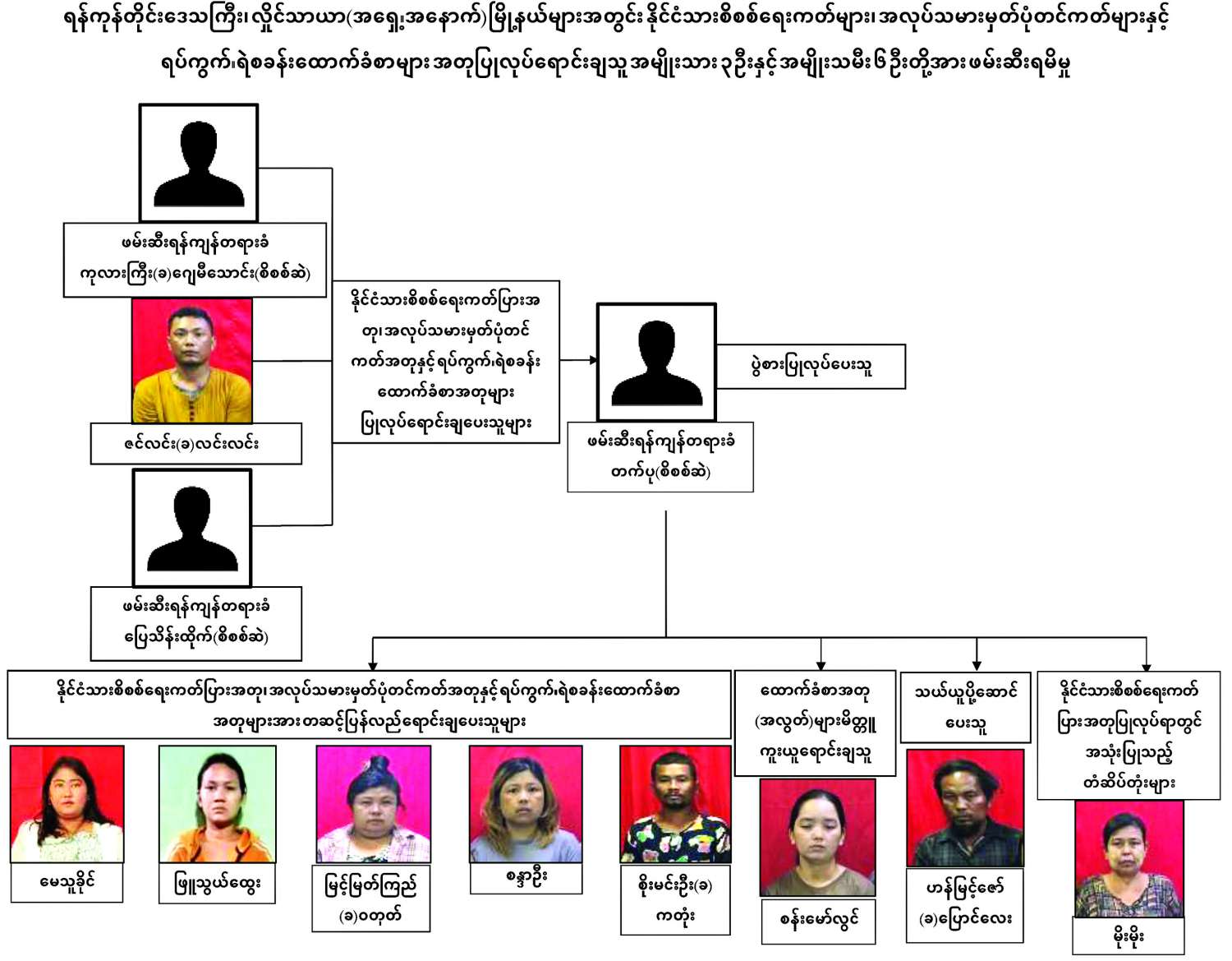 ဖြစ်စဉ်တွင် နိုင်ငံသားစိစစ်ရေးကတ်အတု၊ အလုပ်သမား မှတ်ပုံတင်ကတ်အတုနှင့် ရပ်ကွက်/ ရဲစခန်းထောက်ခံစာအတုများ ပြုလုပ်ရောင်းချသူ ဖမ်းဆီးရမိတရားခံ ဇင်လင်း(ခ) လင်းလင်းပါ ကိုးဦးတို့အား ဥပဒေနှင့်အညီ အရေးယူဆောင်ရွက်လျက်ရှိပြီး ဖမ်းဆီးရန်ကျန် တရားခံများအား ဖမ်းဆီးရမိနိုင်ရေး ဆက်လက်ဆောင်ရွက်လျက်ရှိကြောင်း သတင်းရရှိသည်။
