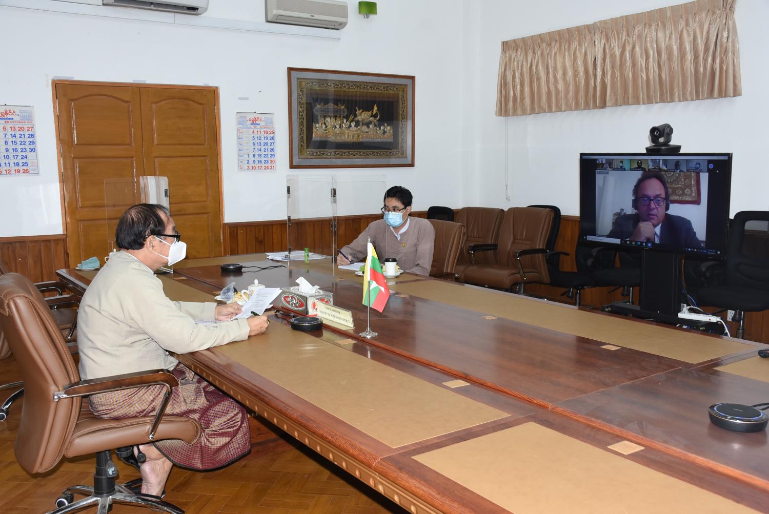 UNOPS အဖွဲ့မှ ဝန်ကြီးဌာန၏ COVID-19 တုံ့ပြန်ဆောင်ရွက်ရေး ဆေးနှင့်ဆေးပစ္စည်းများ ဝယ်ယူ ပံ့ပိုးမှု အခြေအနေ၊ Global Fund ထောက်ပံ့ငွေဖြင့် တီဘီ၊ ခုခံကျ/ကာလ သားနှင့် ငှက်ဖျားရောဂါများ တိုက်ဖျက်ရေး အတွက် (၂၀၂၁-၂၀၂၃) ခုနှစ် အထိ   သဘောတူညီ ချက်လက်မှတ် ရေးထိုးရေးကိစ္စများနှင့် စပ်လျဉ်းသည့် ဆွေးနွေး ပွဲကို ယနေ့မွန်းလွဲပိုင်းတွင် ကျန်းမာရေးနှင့် အားကစားဝန်ကြီးဌာန၌ Video Conferencing စနစ်ဖြင့် ကျင်းပသည်။