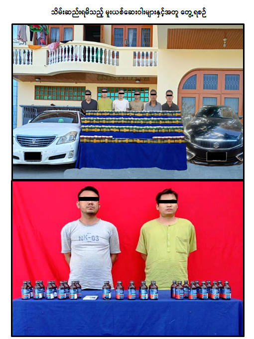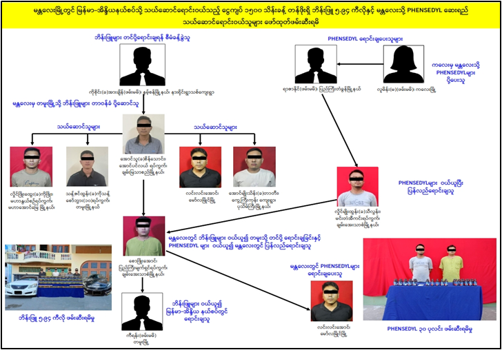 မူးယစ်ဆေးဝါးတားဆီးနှိမ်နင်းရေးရဲတပ်ဖွဲ့မှ တပ်ဖွဲ့ဝင်များပါဝင်သော ပူးပေါင်းအဖွဲ့သည် ဇန်နဝါရီလ ၇ ရက်နေ့ ညနေ ၄ နာရီအချိန် မန္တလေးတိုင်းဒေသကြီး၊ မဟာအောင်မြေမြို့နယ်၊ မဟာမြိုင် (၂) ရပ်ကွက်၊ ၄၁(A)လမ်း၊ ၆၁ x ၆၂ လမ်းကြားတွင် မူးယစ်ဆေးဝါး အရောင်းအဝယ်ပြုလုပ်နေကြောင်း သတင်းအရရှာဖွေစစ်ဆေးခဲ့ရာ စောဖြိုးအောင်၊ လင်းလင်းအောင်၊ လှိုင်ဖြိုးထွေး(ခ)ကိုထွေးနှင့် အောင်မျိုးသိန်း(ခ)တာတီး တို့ ၄ ဦးအား TOYOTA CROWN မော်တော်ယာဉ်တစ်စီး၊ ပလတ်စတစ် ဆပ်ပြာခွက် ၆၆၀ ခွက်ဖြင့်ထည့်လျက် ဘိန်းဖြူ ၅ ဒသမ ၉၄ ကီလိုနှင့်အတူ ဖမ်းဆီးရမိခဲ့ကြောင်း၊ ကွင်းဆက်ဖော်ထုတ်ချက်အရ ယင်းနေ့ညနေ ၄ နာရီခွဲအချိန် ချမ်းအေးသာစံမြို့နယ်၊ ပြည်ကြီးမျက်ရှင် ရပ်ကွက်ရှိ စောဖြိုးအောင်၏နေအိမ်မှ တစ်ပုလင်းလျှင် ၁၀၀ မီလီလီတာစီပါ PHENSEDYL ၃၀ ပုလင်း ထပ်မံဖမ်းဆီးရမိခဲ့ကြောင်း၊ ဖမ်းဆီးရမိမှုဖြစ်စဉ်တွင် ရှမ်းပြည်နယ်တောင်ပိုင်း၊ နမ့်စန်မြို့နယ်၊ နားရိုင်းရွာသစ်ကျေးရွာနေ ကိုစိုင်း(ခ)အားချိန်၏ အစီအမံဖြင့် ချမ်းအေးသာစံမြို့နယ်နေ အောင်သူ(ခ)စိန်သောင်းမှတာဝန်ခံ၍ လှိုင်ဖြိုးထွေး၊ သန့်ဇင်ထွန်း၊ လင်းလင်းအောင်နှင့်ဇော်မျိုးသိန်းတို့အား သယ်ဆောင်ခိုင်းပြီး ချမ်းအေးသာစံမြို့နယ်နေ စောဖြိုးအောင်မှ မန္တလေးမြို့တွင် ဘိန်းဖြူများဝယ်ယူ၍ မြန်မာ-အိန္ဒိယနယ်စပ်၊ တမူးမြို့နယ်သို့ သယ်ဆောင်ရောင်းဝယ်ပြီး မြန်မာ-အိန္ဒိယနယ်စပ်နေကီရန်းမှ ပြန်လည်ရောင်းချခြင်းဖြစ်ကြောင်းနှင့် ကလေးမြို့မှမန္တလေးမြို့သို့ PHENSEDYL များ သယ်ဆောင်ရောင်းဝယ်ခြင်းဖြစ်ကြောင်းသိရှိရသဖြင့် ဘိန်းဖြူရောင်းချပေးခဲ့သည့် အောင်သူနှင့်သန့်ဇင်ထွန်းတို့အား ရှမ်းပြည်နယ် (တောင်ပိုင်း)၊ ပင်လောင်းမြို့နယ်၊ လိန်းလီကျေးရွာအနီးတွင် SUZUKI Ciaz မော်တော်ယာဉ်တစ်စီးနှင့်လည်းကောင်း၊ PHENSEDYL များ ရောင်းချပေးခဲ့သူ လှိုင်မျိုးထွန်း(ခ)သီလွန်းအား မန္တလေးတိုင်းဒေသကြီး၊ ချမ်းအေးသာစံမြို့နယ်၊ မင်းတဲအီကင်းရပ်ကွက်တွင်လည်းကောင်း အသီးသီးဖမ်းဆီးရမိခဲ့၍ ၎င်းတို့အား ဥပဒေအရအရေးယူထားရှိပြီး ကွင်းဆက်ပြစ်မှုကျူးလွန်သူများအား ဆက်လက်စစ်ဆေးဖော်ထုတ်လျက်ရှိကြောင်း မြန်မာနိုင်ငံရဲတပ်ဖွဲ့မှ သတင်းရရှိသည်။