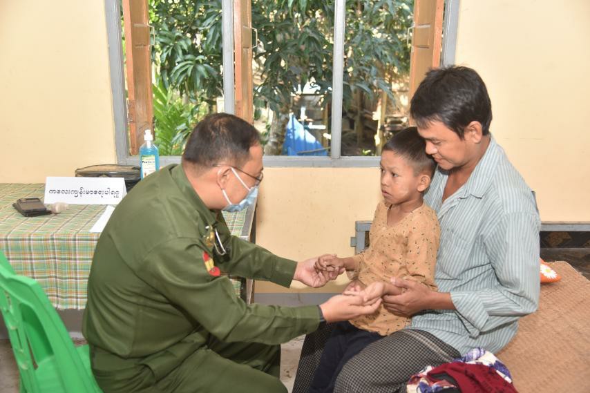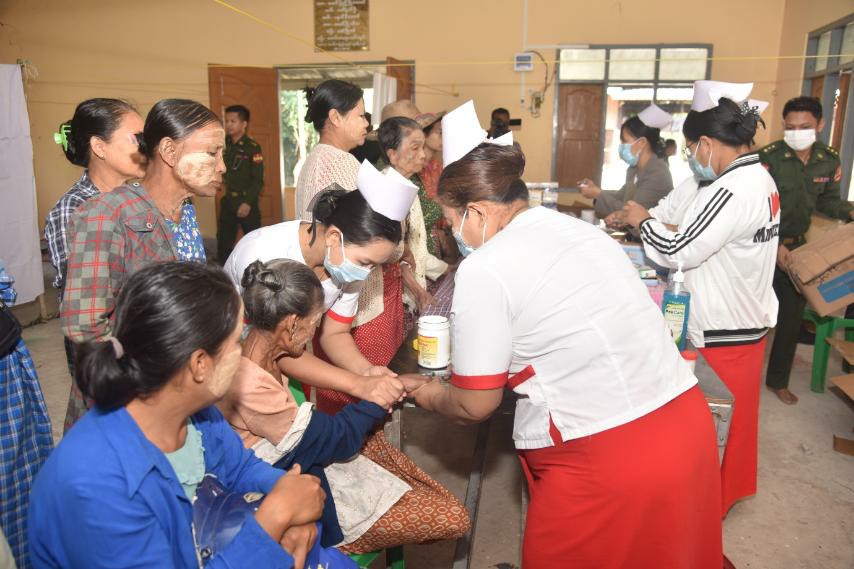 ဧရာဝတီမြစ်ကြောင်းတစ်လျှောက်ရှိ ဒေသခံပြည်သူများအား ကျန်းမာရေးစောင့်ရှောက်မှုလုပ်ငန်းများ ဆောင်ရွက်ပေးရန်အတွက် တပ်မတော်မြစ်တွင်းသွားဆေးရုံ ရေယာဉ်(ရွှေပုဇွန်)၊ မြစ်ရေယာဉ် (စကု)တို့နှင့်အတူ လိုက်ပါလာသည့် တပ်မတော်မှ ပါရဂူများ၊ ဆေးမှူးများ၊ သူနာပြုများပါဝင်သော နယ်လှည့်အထူးကုဆေးအဖွဲ့သည် ယနေ့တွင် ဧရာဝတီတိုင်းဒေသကြီး၊ မအူပင်မြို့နယ်၊ ထနီးကျေးရွာ အောင်ကျိုက္ခမီ ဘုန်းကြီးကျောင်းရှိ ဓမ္မရတနာဗိမာန်တွင်အခြေပြု၍ အဆိုပါမြို့နှင့်ပတ်ဝန်းကျင်ကျေးရွာများမှ ဒေသခံပြည်သူ ၄၅၅ ဦးတို့ကို ကျန်းမာရေးစောင့်ရှောက်မှုလုပ်ငန်းများ ဆောင်ရွက်ပေးသည်။