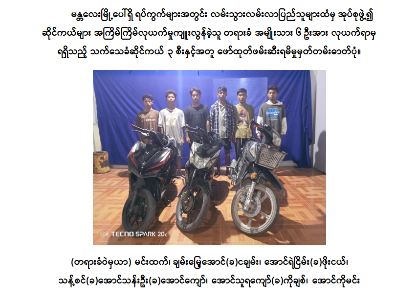 ဖြစ်စဉ်များတွင် မန္တလေးမြို့ပေါ်ရှိ ရပ်ကွက်များအတွင်း လမ်းသွားလမ်းလာပြည်သူများအား အုပ်စုဖွဲ့၍ ဆိုင်ကယ်များ အကြိမ်ကြိမ်လုယက်မှုကျူးလွန်ခဲ့ကြသူများဖြစ်သည့် ဖမ်းဆီးရမိတရားခံ မင်းထက်၊ ချမ်းမြေ့အောင်(ခ)ငချမ်း၊ အောင်ရဲငြိမ်း(ခ)ဖိုးငယ်၊ သန့်စင်(ခ)အောင်သန်းဦး(ခ) အောင်ကျော်၊ အောင်ကိုမင်း၊ အောင်သူရကျော်(ခ)ကိုချစ်တို့ ၆ ဦးအား ဥပဒေနှင့်အညီ ထိရောက်စွာ အရေးယူနိုင်ရေးနှင့် ဖမ်းဆီးရန်ကျန်တရားခံများဖြစ်ကြသည့် ဇော်ထက်(ခ)ဝက်စုတ်နှင့် ကုလားကြီး တို့ ၂ ဦးအား ဖမ်းဆီးရမိနိုင်ရေး ဆောင်ရွက်လျက်ရှိကြောင်းနှင့် မိဘပြည်သူများအနေဖြင့် ရပ်ရွာ များအတွင်း အလားတူ ဒုစရိုက်မှုများမဖြစ်ပွားစေရေးနှင့် ဒုစရိုက်သမားများ၏ လှုပ်ရှားဆောင်ရွက် မှုသတင်းများအား တွေ့ရှိပါက သက်ဆိုင်ရာ လုံခြုံရေးအဖွဲ့အစည်းများထံသို့ သတင်းပေးပို့နိုင် ပါကြောင်း မြန်မာနိုင်ငံရဲတပ်ဖွဲ့မှ အသိပေးသတင်းထုတ်ပြန်အပ်ပါသည်။