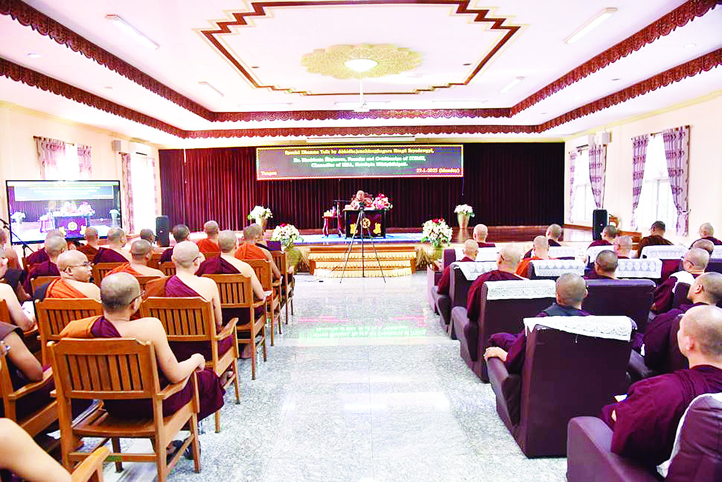 နိုင်ငံတော်သြဝါဒါစရိယ ရွှေကျင်နိကာယာဓိပတိ ရွှေကျင်သာသနာပိုင် သီတဂူကမ္ဘာ့ဗုဒ္ဓတက္ကသိုလ်များ၏အဓိပတိ အပြည်ပြည်ဆိုင်ရာ ထေရဝါဒဗုဒ္ဓသာသနာပြု တက္ကသိုလ်တည်ထောင်သူနှင့် သြဝါဒါစရိယအဖွဲ့ဝင် အဘိဓဇမဟာရဋ္ဌဂုရု အဘိဓဇအဂ္ဂမဟာ သဒ္ဓမ္မဇောတိက သီတဂူဆရာတော် ဒေါက်တာဘဒ္ဒန္တဉာဏိဿရသည် အပြည်ပြည်ဆိုင်ရာထေရဝါဒဗုဒ္ဓသာသနာပြု တက္ကသိုလ်၌ ၂၀၂၄-၂၀၂၅ ပညာသင်နှစ် ဒီပလိုမာတန်းမှ ပါရဂူတန်းအထိ တက်ရောက်လျက်ရှိသော ပြည်တွင်းပြည်ပမှ သင်တန်းသားသင်တန်းသူများအား ယနေ့မွန်းလွဲပိုင်းတွင် အပြည်ပြည်ဆိုင်ရာထေရဝါဒ ဗုဒ္ဓသာသနာပြုတက္ကသိုလ် Seminar Hall တွင် Special Dhamma Talk ပို့ချသည်။