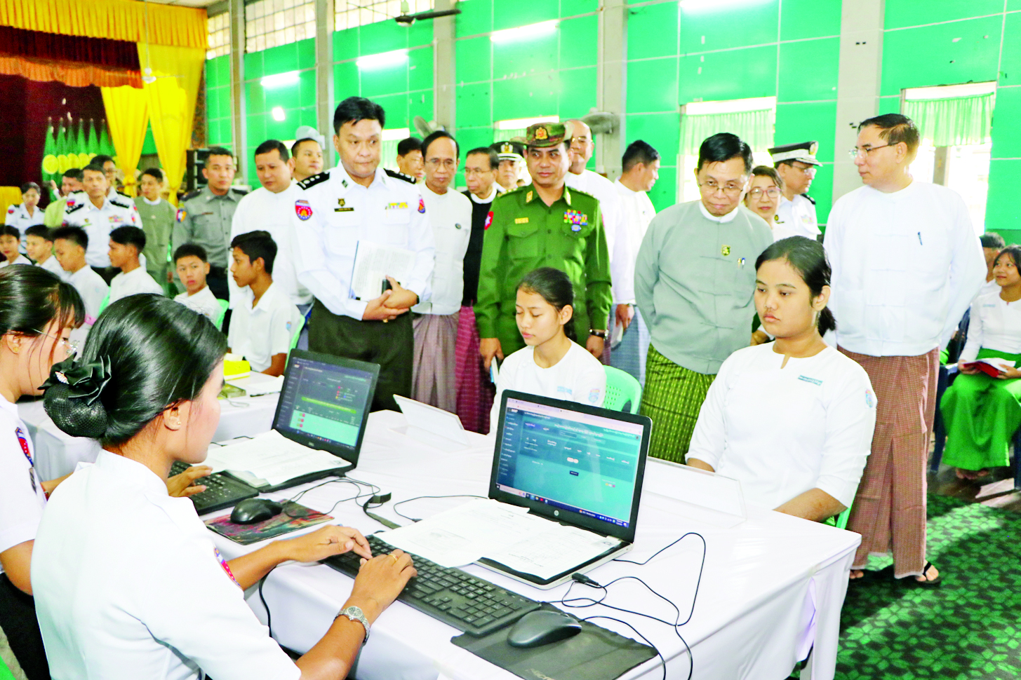 အစည်းအဝေးအပြီးတွင် ပြည်ထောင်စုဝန်ကြီးနှင့်အဖွဲ့သည် ပဲခူးမြို့အမှတ်(၃)အခြေခံပညာ အထက်တန်းကျောင်း၌ ပဲခူးမြို့နယ်ဦးစီးမှူးရုံးမှ ဝန်ထမ်းများက အဆိုပါကျောင်းရှိ အသက်ပြည့်မီသည့် ကျောင်းသား ကျောင်းသူများအား ပန်းခင်းစီမံချက်အဆင့်(၃)ဖြင့် လုပ်ငန်းစဉ်အဆင့်အလိုက် နိုင်ငံသားစိစစ်ရေးကတ်ပြား ထုတ်ပေးနေမှုနှင့် နိုင်ငံသားကတ်ပြားရရှိပြီးသည့် ကျောင်းသား ကျောင်းသူများကို e-ID စနစ်ဖြင့် Biographic/Biometric ကောက်ယူကာ ဂဏန်း ၁၀ လုံးပါ Unique ID နံပါတ်ထုတ်ပေးခြင်းလုပ်ငန်းကို One Stop Service ဖြင့် တစ်ပါတည်းဆောင်ရွက်ပေးနေမှုတို့ကို လှည့်လည်ကြည့်ရှုပြီး လိုအပ်သည်များကို မှာကြားညှိနှိုင်းဆောင်ရွက်ပေးခဲ့ကြောင်းနှင့် ယနေ့တွင် ကျောင်းသား ကျောင်းသူ ၂၅၈ ဦးကို နိုင်ငံသားစိစစ်ရေးကတ်ပြား စိစစ်ထုတ်ပေးပြီး Biometric ကောက်ယူကာ Unique ID နံပါတ် တစ်ပါတည်းထုတ်ပေးနိုင်ခဲ့ကြောင်း သိရသည်။