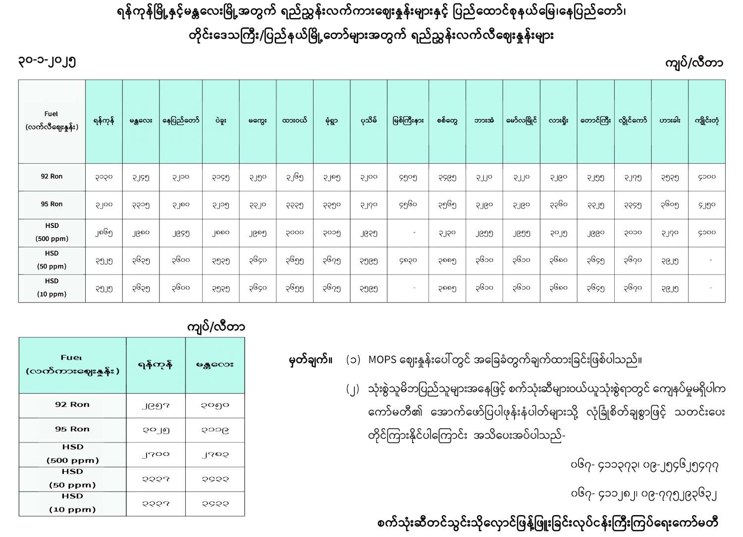ရန်ကုန်မြို့နှင့် မန္တလေးမြို့အတွက် ရည်ညွှန်းလက်ကားဈေးနှုန်းများနှင့် ပြည်ထောင်စုနယ်မြေ နေပြည်တော်၊ တိုင်းဒေသကြီး/ပြည်နယ် မြို့တော်များအတွက် ရည်ညွှန်းလက်လီဈေးနှုန်းများ 01/30/2025