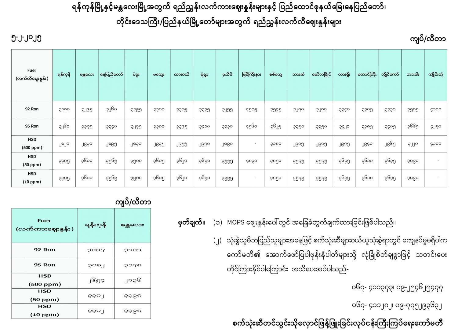 ရန်ကုန်မြို့နှင့် မန္တလေးမြို့အတွက် ရည်ညွှန်းလက်ကားဈေးနှုန်းများနှင့် ပြည်ထောင်စုနယ်မြေ နေပြည်တော်၊ တိုင်းဒေသကြီး/ပြည်နယ် မြို့တော်များအတွက် ရည်ညွှန်းလက်လီဈေးနှုန်းများ 02/05/2025