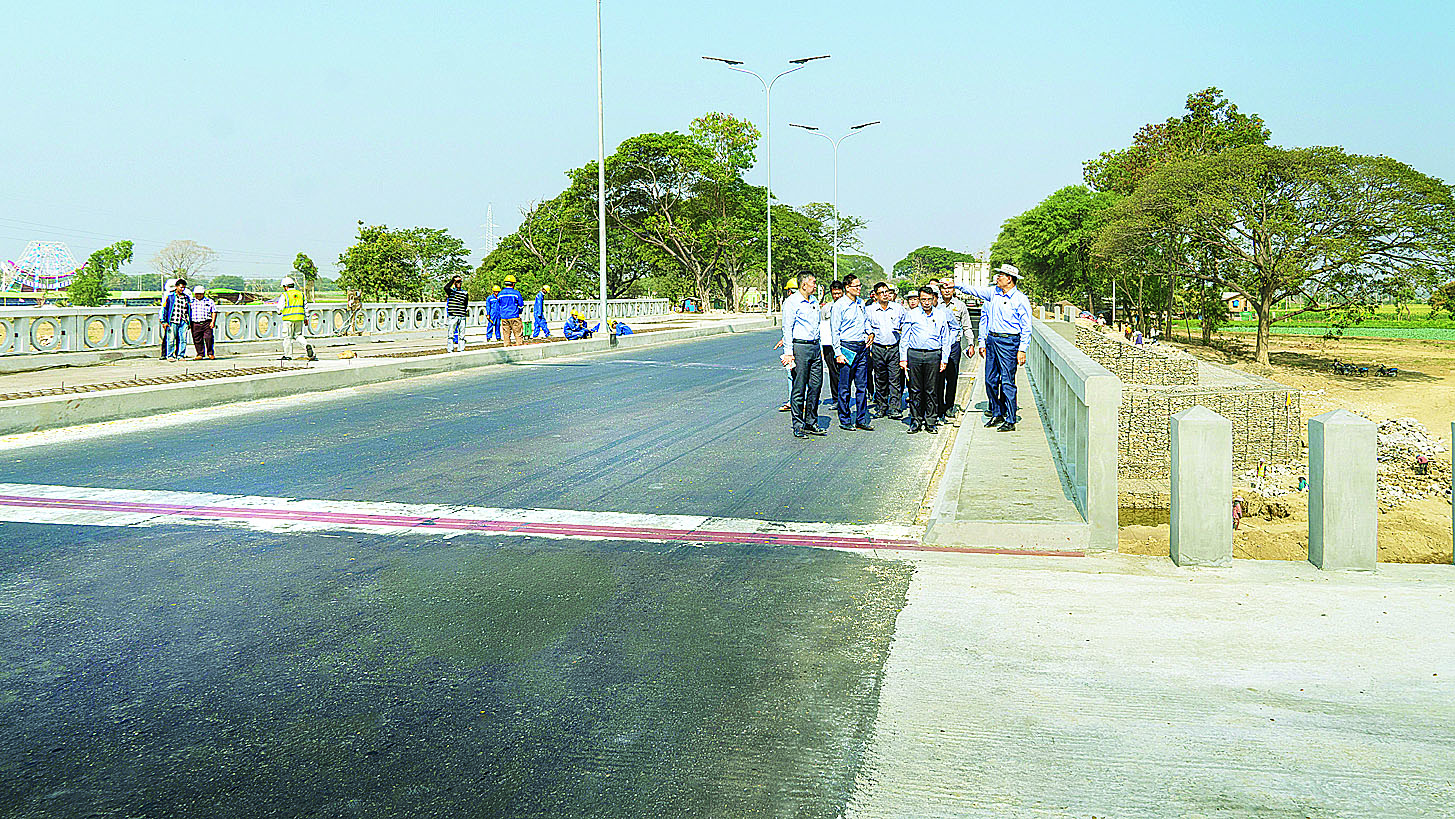 ယင်းနောက် ပြည်ထောင်စုဝန်ကြီးနှင့် အဖွဲ့သည် ရန်ကုန်-မန္တလေး ပြည်ထောင်စုလမ်းမကြီး နေပြည်တော်ကောင်စီနယ်မြေအတွင်း ယခင်လေးလမ်းသွားအဆင့်မှ ခြောက်လမ်းသွားအဆင့် လမ်းတာပေါင်တိုးချဲ့ခြင်းဆောင်ရွက်ပြီးစီးမှု၊ လမ်းဘေးဝဲ၊ ယာတွင် စိုက်ပျိုးထားသည့် သစ်ပင်များ ရှင်သန်ဖြစ်ထွန်းနေမှုနှင့် ရေစီးရေလာကောင်းမွန်စေရေးဆောင်ရွက်ထားသည့် အခြေအနေတို့ကိုလည်းကောင်း၊ မွန်းတည့် ခွင်-ကျည်တောင်-ခေါမ-ညောင်ပင်သာလမ်းပေါ်ရှိ ရေတိုက်စားပျက်စီးသွားသည့် ပေါင်းလောင်းတံတား(အဝေရာ)၏ ချဉ်းကပ်လမ်းများ ပြုပြင်ပြီးစီးမှုနှင့် တံတားကြံ့ခိုင်ရေးထိန်းသိမ်းဆောင်ရွက်သည့် အခြေအနေတို့ကိုလည်းကောင်း လိုက်လံကြည့်ရှုစစ်ဆေးပြီး တာဝန်ရှိသူများအား လုပ်ငန်းလိုအပ်ချက်များ မှာကြားခဲ့ကြောင်း သိရှိရသည်။