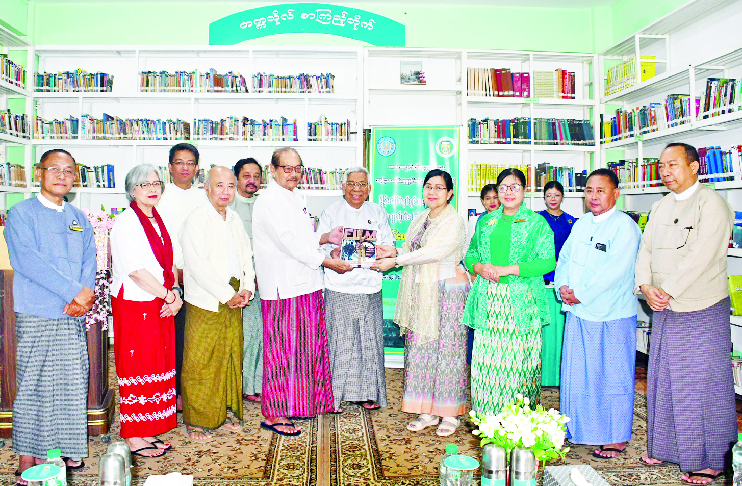 ယင်းနောက် မြန်မာနိုင်ငံရုပ်ရှင်အစည်းအရုံးဥက္ကဋ္ဌနှင့်အဖွဲ့ဝင်များက စာအုပ်များပေးအပ်လှူဒါန်းရာ ဒုတိယဝန်ကြီးနှင့် ပါမောက္ခချုပ်တို့က လက်ခံပြီး ဒုတိယဝန်ကြီးက ဂုဏ်ပြုမှတ်တမ်းလွှာ ပြန်လည်ပေးအပ်ကာ ဒုတိယဝန်ကြီးနှင့် အခမ်းအနားသို့ တက်ရောက်လာသူများသည် စာကြည့်တိုက်တွင် ခင်းကျင်းပြသထားသည့် စာအုပ်စာစောင်များကို ကြည့်ရှုလေ့လာကြသည်။