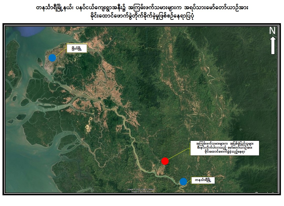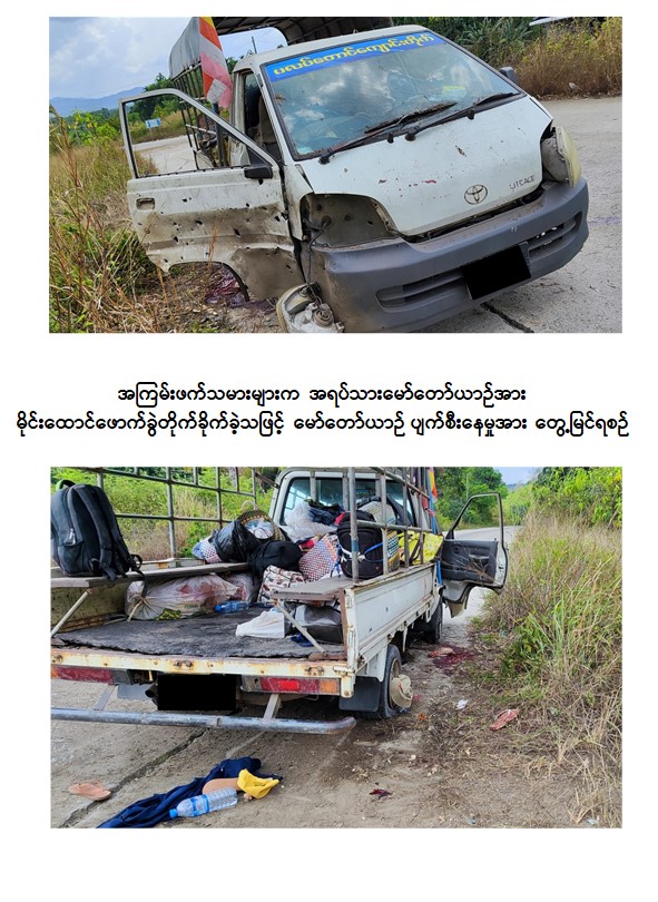 ထိုသို့ လုပ်ဆောင်လျက်ရှိရာ တနင်္သာရီတိုင်းဒေသကြီး၊ တနင်္သာရီမြို့နယ်၊ ပနပ်ငယ်ကျေးရွာအနီး၌ အပြစ်မဲ့ပြည်သူများစီးနင်းလာသည့် ဘုရားဖူးယာဉ် ၁ စီးကိုလည်း ယနေ့မွန်းလွဲ ၂ နာရီခန့်တွင် အကြမ်းဖက်သမားများက မိုင်းထောင်ဖောက်ခွဲခဲ့ကြောင်း သိရှိရသည်။