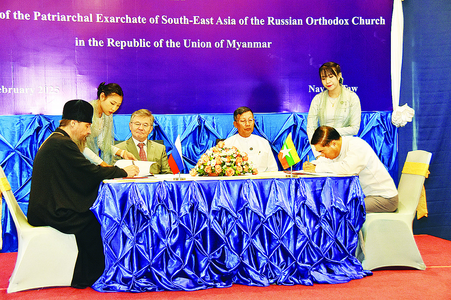 သာသနာရေးနှင့်ယဉ်ကျေးမှုဝန်ကြီးဌာန သာသနာရေးဦးစီးဌာနနှင့် ရုရှားဖက်ဒရေးရှင်းနိုင်ငံ ရုရှားအော်သိုဒေါ့ ခရစ်ယာန်အသင်းတော်တို့အကြား သာသနာရေးလုပ်ငန်း ဆောင်ရွက်ခွင့်ပြုခြင်းဆိုင်ရာ သဘောတူစာချုပ် (LOA) လက်မှတ်ရေးထိုးခြင်း အခမ်းအနားကို ယနေ့မွန်းလွဲပိုင်းတွင် နေပြည်တော်ရှိ M Gallery Hotel ၌ ကျင်းပသည်။