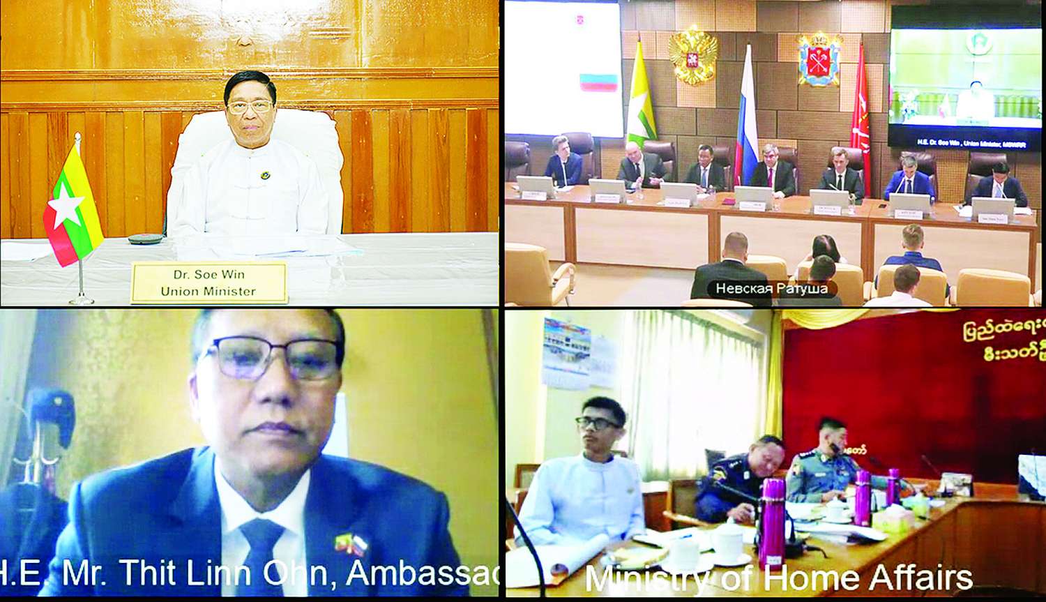 ရုရှားဖက်ဒရေးရှင်းနိုင်ငံနှင့် မြန်မာနိုင်ငံတို့အကြား သံတမန်ဆက်ဆံရေး (၇၇) နှစ်မြောက် အထိမ်းအမှတ်အဖြစ် သဘာဝဘေးအန္တရာယ် ကြိုတင်ပြင်ဆင်ရေးနှင့် အရေးပေါ်တုံ့ပြန်ရေးဆိုင်ရာဆွေးနွေးပွဲကို ရုရှားနိုင်ငံ စိန့်ပီတာစဘတ်မြို့၌ ယနေ့မွန်းလွဲပိုင်းတွင် ကျင်းပပြုလုပ်ရာ လူမှုဝန်ထမ်း၊ ကယ်ဆယ်ရေးနှင့်ပြန်လည်နေရာချထားရေးဝန်ကြီးဌာန ပြည်ထောင်စုဝန်ကြီး ဒေါက်တာစိုးဝင်းသည် Video Conferening စနစ်ဖြင့် ပါဝင်တက်ရောက်၍ အမှာစကားပြောကြားသည်။