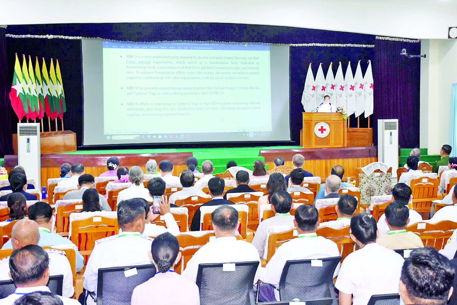 ဦးစွာ ဒုတိယဝန်ကြီး ပါမောက္ခ ဒေါက်တာအေးထွန်းက မြန်မာနိုင်ငံ ကြက်ခြေနီအသင်းအနေဖြင့် နာဂစ်မုန်တိုင်း၊ ဆိုင်ကလုန်းမုန်တိုင်း၊ မိုခါနှင့် တိုင်ဖွန်းမုန်တိုင်း ရာဂီကဲ့သို့ သဘာဝဘေးအန္တရာယ်သာမက ကိုဗစ်-၁၉ ကဲ့သို့သော ကပ်ရောဂါကျရောက်ချိန်များမှာပါ ကူညီဆောင်ရွက်ပေးခဲ့ကြောင်း၊ ၂၀၂၄ ခုနှစ် စက်တင်ဘာလတွင် တိုက်ခတ်ခဲ့သည့် တိုင်ဖွန်းမုန်တိုင်းရာဂီကြောင့် ဘေးအန္တရာယ်ကျရောက်ခဲ့သည့် ပြည်သူများကို အရေးပေါ်ကယ်ဆယ်ရေးလုပ်ငန်းများ အင်တိုက်အားတိုက် လုပ်ဆောင်ပေးခဲ့ကြခြင်းကို မီဒီယာများတွင် တွေ့မြင်ရပါကြောင်း၊ ထိုကဲ့သို့အစီအစဉ်ကောင်းများကို ဆက်လက်ဆောင်ရွက်ပေးကြရန်နှင့် မူးယစ်ဆေး၏ ဆိုးကျိုးများကို အများသိအောင် အသိပညာပေးရာတွင် ကြက်ခြေနီအနေဖြင့် ပါဝင်ပေးကြရန် အခွင့်ကြုံတုန်း တိုက်တွန်းမှာကြားလိုပါကြောင်း။