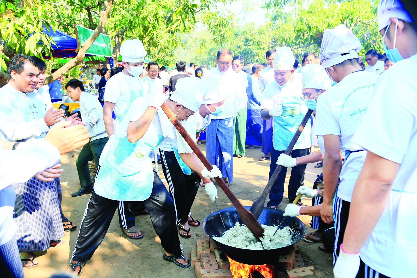 ဦးစွာ ပြည်ထောင်စုဝန်ကြီးက မြန်မာ့ရိုးရာထမနဲထိုးပြိုင်ပွဲကိုဖွင့်လှစ်ပေးပြီး ဦးစီးဌာန၊ လုပ်ငန်းနှင့် တက္ကသိုလ်တို့မှ ပြိုင်ပွဲဝင်အသင်း ၁၂ သင်း၏ ထမနဲထိုးယှဉ်ပြိုင်နေမှုကို လှည့်လည်ကြည့်ရှု အားပေးသည်။