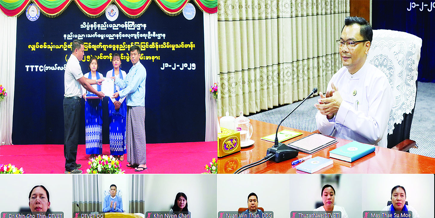 လျှပ်စစ်သုံးယာဉ်နှင့်ဆက်စပ်ပစ္စည်းများ သုတေသနဖွံ့ဖြိုးရေးနှင့် နည်းပညာပြန့်ပွားရေးလုပ်ငန်းကော်မတီဥက္ကဋ္ဌ ဒုတိယဝန်ကြီး ဒေါက်တာအောင်ဇေယျသည် ယမန်နေ့က နည်းပညာ၊ သက်မွေးပညာနှင့် လေ့ကျင့်ရေး ဆရာအတတ်သင်ကောလိပ် (TTTC ဘယ်လင်း)၌ ကျင်းပသည့် EV ပြုပြင်ထိန်းသိမ်းမှုသင်တန်း (၂/၂၀၂၅) ဆင်းပွဲအခမ်းအနားသို့ ဗီဒီယိုကွန်ဖရင့်စနစ်ဖြင့် တက်ရောက်သည်။