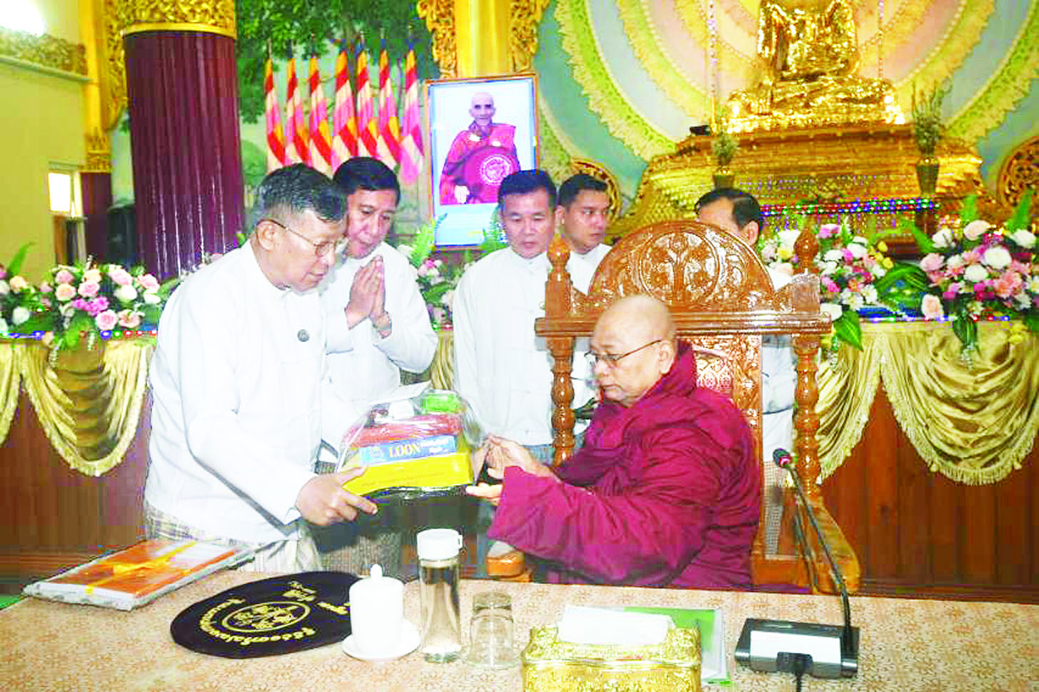 အစည်းအဝေးအပြီးတွင် ပြည်ထောင်စုဝန်ကြီးက ဆရာတော်ကြီးများအား လှူဖွယ်ဝတ္ထုပစ္စည်းများနှင့် ပရိတ်တော်၊ ဒေသနာတော်၊ ပါဠိ - မြန်မာစာအုပ်များ ဆက်ကပ်လှူဒါန်းသည်။