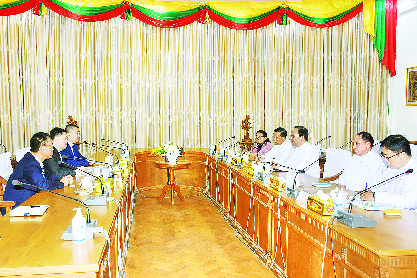 ကျန်းမာရေးဝန်ကြီးဌာန ပြည်ထောင်စုဝန်ကြီး ဒေါက်တာသက်ခိုင်ဝင်းအား ပေကျင်းဟုန်ဖန်းရင်းနှီးမြှုပ်နှံမှုကုမ္ပဏီလီမိတက်မှ Mr. Zhou Xiaofeng ဦးဆောင်သည့် ကိုယ်စားလှယ်အဖွဲ့သည် ယနေ့မွန်းလွဲပိုင်းတွင် ကျန်းမာရေးဝန်ကြီးဌာန အစည်းအဝေးခန်းမ၌ လာရောက်တွေ့ဆုံသည်။