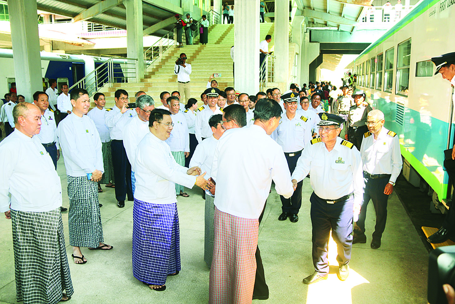 ဒုတိယဝန်ကြီးချုပ်နှင့် ပို့ဆောင်ရေးနှင့်ဆက်သွယ်ရေးဝန်ကြီးဌာန ပြည်ထောင်စုဝန်ကြီး ဗိုလ်ချုပ်ကြီး မြထွန်းဦးသည် နေပြည်တော်ကောင်စီဥက္ကဋ္ဌ ဦးသန်းထွန်းဦးနှင့် ဒုတိယဝန်ကြီးများ၊ အမြဲတမ်းအတွင်းဝန်နှင့် မြန်မာ့မီးရထားတာဝန်ရှိသူများလိုက်ပါလျက် နေပြည်တော် ဘူတာကြီးတွင် အမှတ်(၂၈)အစုန် မန္တလေး-နေပြည်တော်လေအိတ်ရထားခရီးစဉ်သစ်ဖြင့် နံနက် ၁၁ နာရီတွင် ဆိုက်ရောက်လိုက်ပါလာကြသည့် ခရီးသည်များအားလည်းကောင်း၊ အမှတ်(၇)အဆန် ရန်ကုန်-နေပြည်တော်ခေတ်မီ DEMU ရထားခရီးစဉ်သစ်ဖြင့် နံနက် ၁၁ နာရီခွဲတွင် ဆိုက်ရောက်လိုက်ပါလာကြသည့် ခရီးသည်များအားလည်းကောင်း ခင်မင်ရင်းနှီးစွာ ကြိုဆိုနှုတ်ဆက်သည်။ ဆက်လက်၍ ဒုတိယဝန်ကြီးချုပ်နှင့် ပြည်ထောင်စုဝန်ကြီးဗိုလ်ချုပ်ကြီး မြထွန်းဦးနှင့် နေပြည်တော်ကောင်စီ၊ ဥက္ကဋ္ဌ ဦးသန်းထွန်းဦးတို့သည် နေပြည်တော်ဘူတာမှ ရန်ကုန်သို့ မွန်းတည့် ၁၂ နာရီတွင် ထွက်ခွာမည့် အမှတ်(၈)အစုန် ခေတ်မီ DEMU ရထားခရီးစဉ်သစ်ဖြင့်လိုက်ပါမည့် ခရီးသည်များအားလည်းကောင်း၊ ဒုတိယဝန်ကြီး ဦးလူမွန်နှင့် ဌာနဆိုင်ရာအကြီးအကဲများသည် မွန်းတည့် ၁၂ နာရီတွင် မန္တလေးသို့ ထွက်ခွာမည့် အမှတ်(၂၇) အဆန်လေအိတ်ရထား ခရီးစဉ်သစ်ဖြင့် လိုက်ပါသွားကြမည့် ရထားစီးခရီးသည်များကိုလည်းကောင်း စားသောက်ဖွယ်ရာများ အသီးသီးပေးအပ်ပြီး ခင်မင်ရင်းနှီးစွာ ပို့ဆောင်နှုတ်ဆက်သည်။ နေပြည်တော်ဘူတာမှ ထွက်ခွာကြသည့် အမှတ်(၂၇) အဆန်လေအိတ်ရထားသည် မန္တလေးသို့ ညနေ ၅ နာရီနှင့် အမှတ် (၈) အစုန် ခေတ်မီ DEMU ရထားသည် ရန်ကုန်သို့ ညနေ ၅ နာရီခွဲတွင် အသီးသီးရောက်ရှိကြသည်။