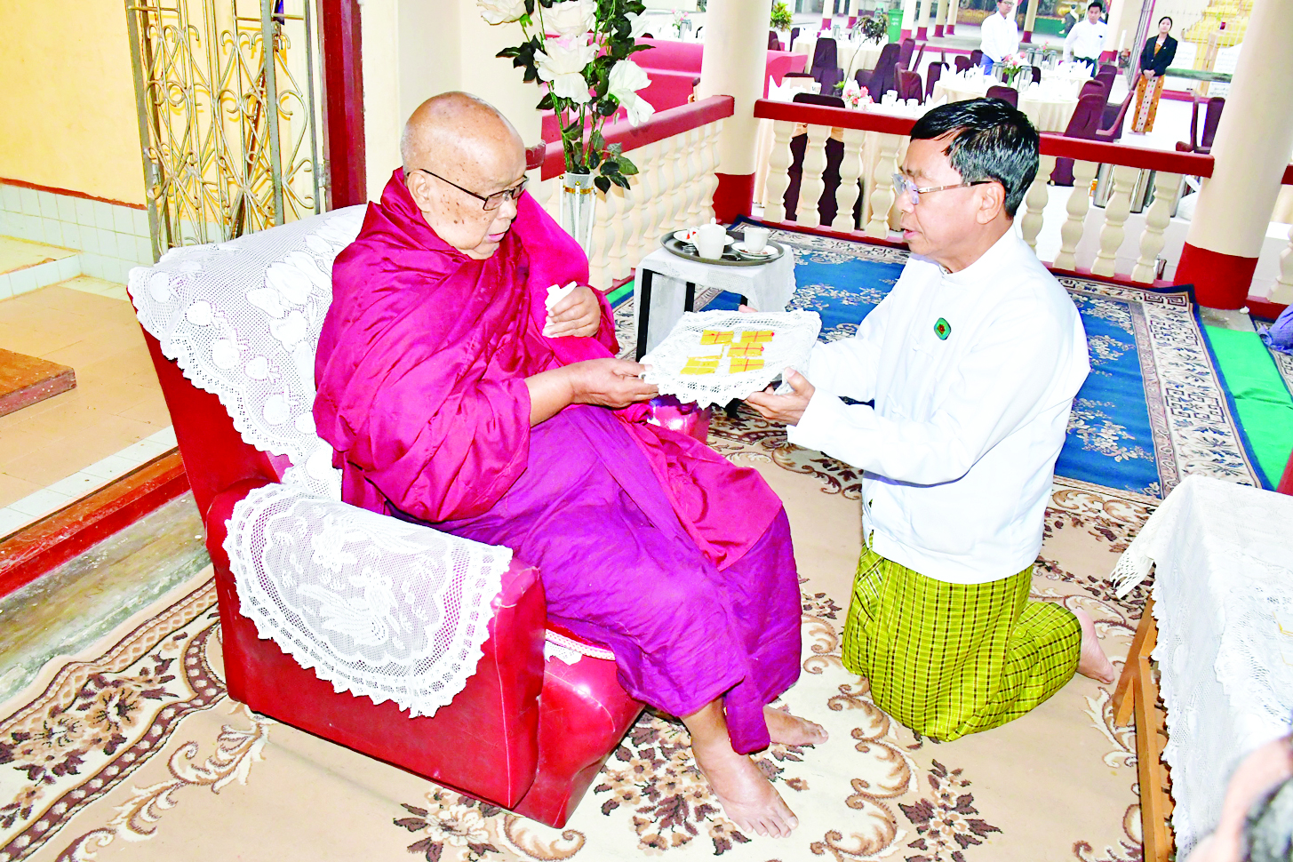 ဦးစွာ နေပြည်တော်ကောင်စီဥက္ကဋ္ဌက ပေါက်မြိုင် ကျောင်းတိုက်ဆရာတော် ဘဒ္ဒန္တဇနိန္ဒထံ စေတီတော်မြတ်ကြီးအား လုံးတော်ပြည့်ရွှေသင်္ကန်းကပ်လှူမည့် ရွှေဆိုင်းများနှင့် လူဖွယ်ဝတ္ထုပစ္စည်းများကို ဆက်ကပ်လှူဒါန်းသည်။