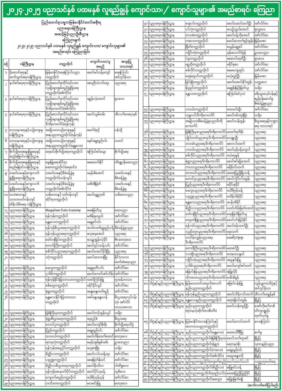 ၂၀၂၄-၂၀၂၅ ပညာသင်နှစ် ပထမနှစ် လူရည်ချွန် ကျောင်းသား/ ကျောင်းသူများ၏ အမည်စာရင်း ကြေညာ