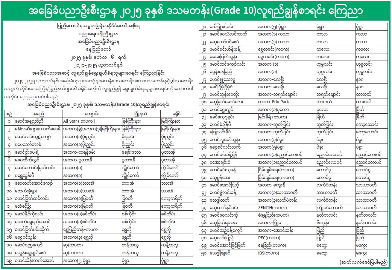 အခြေခံပညာဦးစီးဌာန၊ ၂၀၂၅ ခုနှစ်၊ ဒသမတန်း(Grade 10) လူရည်ချွန်စာရင်းကြေညာ