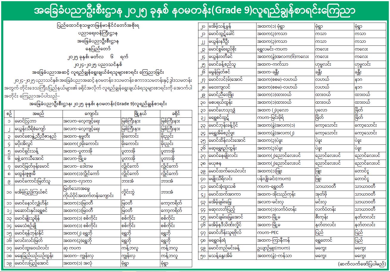 အခြေခံပညာဦးစီးဌာန၊ ၂၀၂၅ ခုနှစ်၊ နဝမတန်း(Grade 9) လူရည်ချွန်စာရင်းကြေညာ