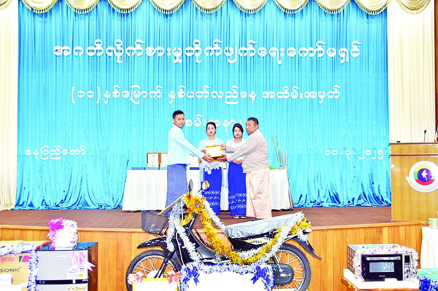 ဆက်လက်၍ ကော်မရှင်အတွင်းရေးမှူးက နိုင်ငံ့ဝန်ထမ်းတက္ကသိုလ်တွင် ဖွင့်လှစ်သည့်သင်တန်းများ၌ ထူးချွန်စွာအောင်မြင်ခဲ့သည့် ကော်မရှင်ရုံးဝန်ထမ်းများကို ဆုများချီးမြှင့်ခဲ့ပြီး ကော်မရှင်အဖွဲ့ဝင် ဦးကျော်ဝင်းသိန်းကအိမ်ရာ၊ အဆောင်များအလိုက် ပတ်ဝန်းကျင်သန့်ရှင်းသာယာလှပရေးဆောင်ရွက်မှု၊ သီးပင်၊ စားပင်များ စုပေါင်းစိုက်ပျိုးမှုနှင့် စည်းကမ်း ကောင်းမွန်မှုတို့အတွက် ပထမ၊ ဒုတိယ၊ တတိယ၊ နှစ်သိမ့်ဆုများရရှိခဲ့သည့် အိမ်ရာ၊ အဆောင်တာဝန်ခံများကို ဆုချီးမြှင့်သည်။ ယင်းနောက်ဗလာမပါ ကံစမ်းမဲဖောက်ချီးမြှင့်ပေးခြင်းဖြင့် ပျော်ရွှင်စွာကျင်းပခဲ့ကြောင်း သိရသည်။