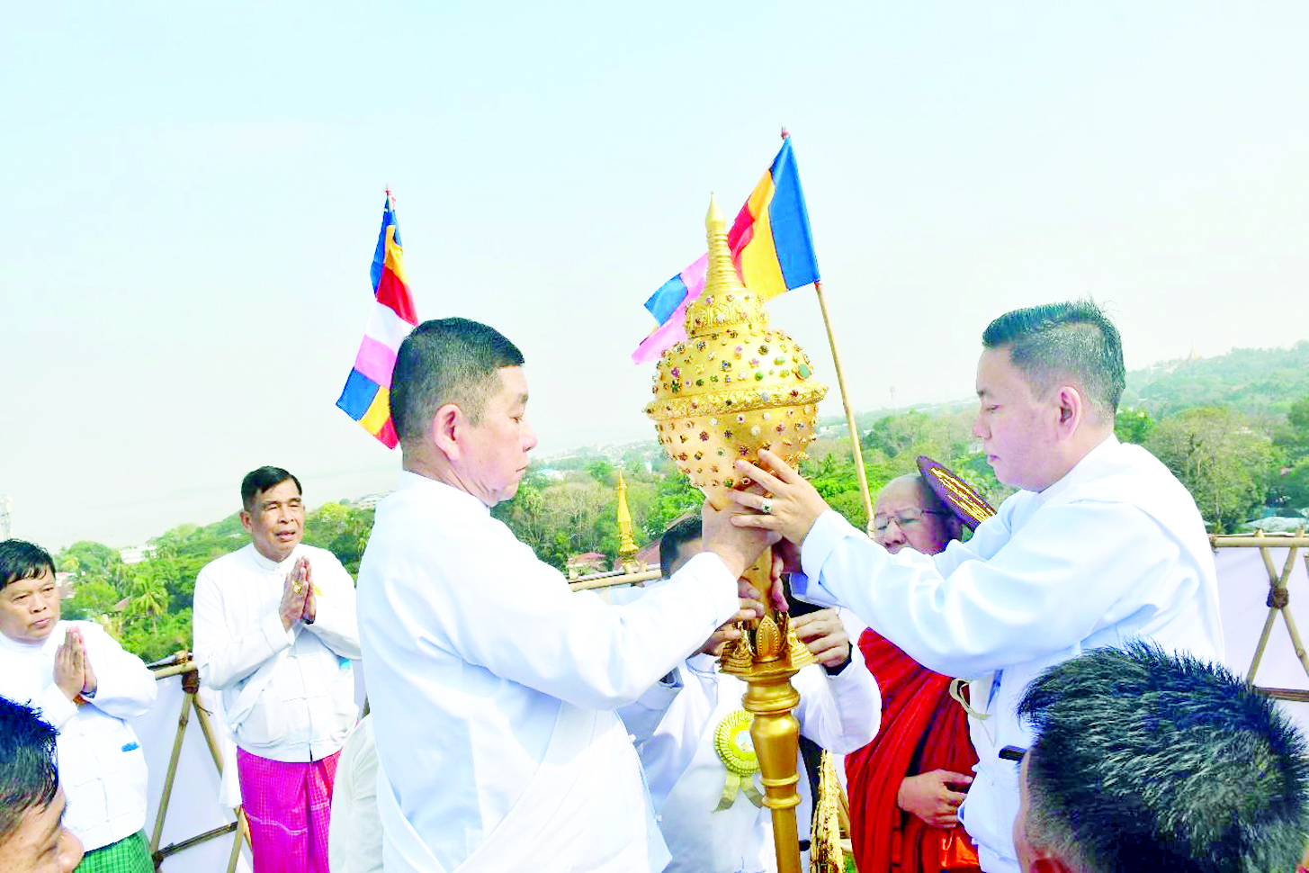 ယင်းနောက် ပြည်နယ်ဝန်ကြီးချုပ်၊ တိုင်းမှူးနှင့် တာဝန်ရှိသူများက စေတီတော်မြတ်ကြီးတွင် ပူဇော်မည့် စိန်ဖူးတော်၊ ငှက်မြတ်နားတော်တို့ကို ဆရာတော်ကြီးများထံ ဆက်ကပ်လှူဒါန်းကြသည်။ ဆက်လက်၍ ပြည်နယ်ဝန်ကြီးချုပ်၊ တိုင်းမှူးနှင့် တာဝန်ရှိသူများက ဆရာတော်၊ သံဃာတော်များထံ လှူဖွယ်ပစ္စည်းများ ဆက်ကပ်လှူဒါန်းကြပြီး လှူဒါန်းမှုအစုစုအတွက် မော်လမြိုင်မြို့ ဝေဇယန္တာကျောင်း ဆရာတော် မဟာသဒ္ဓမ္မဇောတိကဓဇ ဘဒ္ဒန္တစန္ဒောဘာသထံမှ အနုမောဒနာတရားနာယူကာ ရေစက်သွန်းချအမျှပေးဝေကြသည်။