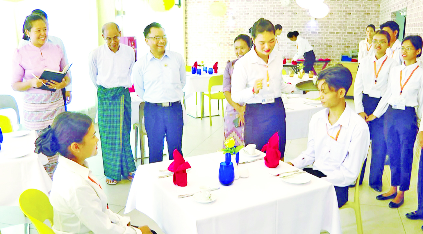 ယင်းနောက် ဒုတိယဝန်ကြီးသည် အင်ဂျင်နီယာဘာသာရပ်ဌာနများရှိ စာသင်ခန်းများ၊ အလုပ်ရုံများ၊ လက်တွေ့ခန်းများ၊ ဟိုတယ်နှင့်ခရီးသွားဘာသာရပ်သင်တန်းများတွင် ကျောင်းသား ကျောင်းသူများက လက်တွေ့လေ့ကျင့်နေမှုအခြေအနေများကို ကြည့်ရှုအားပေးကာ နိုင်ငံတော်မှ လူငယ်များ၏ အလုပ်အကိုင်အခွင့်အလမ်းများ ထိရောက်မြန်ဆန်စွာ ဖန်တီးပေးနိုင်ရေး မွန်မြတ်လှသော အခမဲ့အသက်မွေးဝမ်းကျောင်းသင်တန်းများ ဖွင့်လှစ်ပေးကာ ပံ့ပိုးဆောင်ရွက်ပေးလျက်ရှိသည်ကို တန်ဖိုးထားလေ့ကျင့်ကြရန်နှင့် နိုင်ငံတော်အပေါ် ကျေးဇူးပြန်ဆပ်သည့်အနေဖြင့် ပြည်သူများကို အမှန်တကယ်အလုပ်အကျွေးပြုနိုင်သည့် ဗလငါးတန်နှင့် ပြည့်စုံသော လူကောင်းများ ဖြစ်စေရေးရည်မှန်းချက်ချမှတ်ပြီး ဆောင်ရွက်ကြရန်မှာကြားသည်။