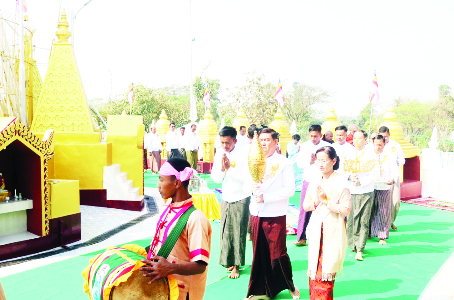 ဆက်လက်၍ ပြည်နယ်ဝန်ကြီးချုပ်၊ တိုင်းမှူးနှင့် တက်ရောက်လာကြသူများက ဆရာတော်၊ သံဃာတော်များ ရွတ်ပွားချီးမြှင့်တော်မူသော ပရိတ်တရားတော်များကို နာယူကြည်ညိုကြပြီး စိန်ဖူးတော်၊ ငှက်မြတ်နားတော်များအားပင့်ဆောင်၍ တင်လှူပူဇော်ခဲ့ကြသည်။