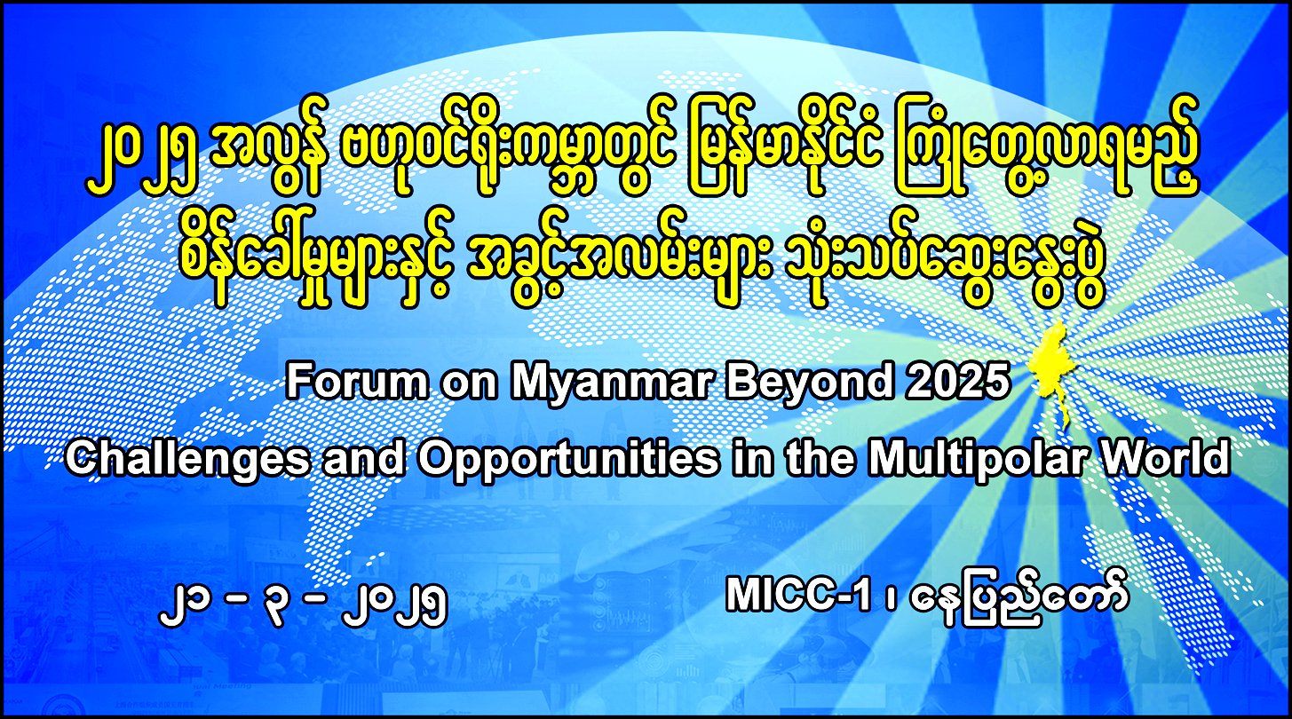 ၂၀၂၅ အလွန် ဗဟုဝင်ရိုးကမ္ဘာတွင် မြန်မာနိုင်ငံကြုံတွေ့လာရမည့် စိန်ခေါ်မှုများနှင့် အခွင့်အလမ်းများ သုံးသပ်ဆွေးနွေးပွဲ ကျင်းပမည် 03/15/2025