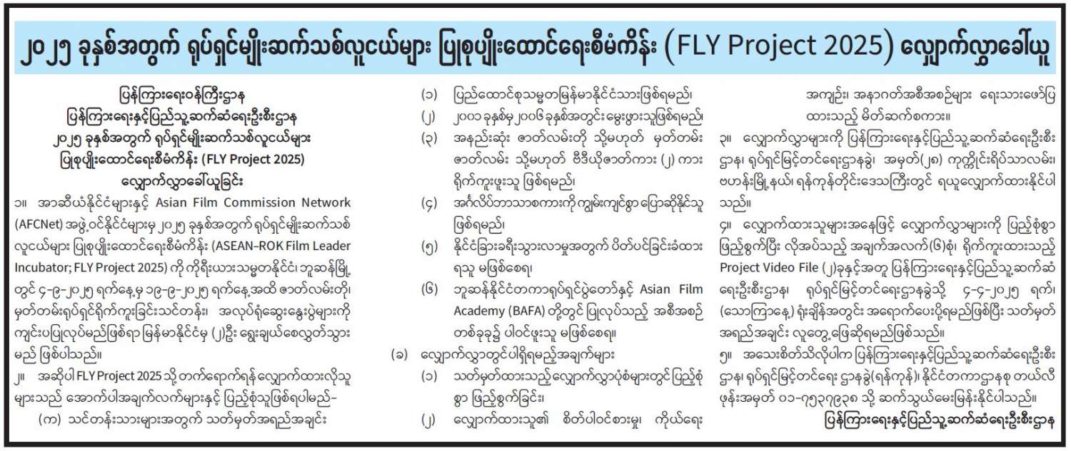 ၂၀၂၅ ခုနှစ်အတွက် ရုပ်ရှင်မျိုးဆက်သစ်လူငယ်များ ပြုစုပျိုးထောင်ရေးစီမံကိန်း (FLY Project 2025) လျှောက်လွှာခေါ်ယူ 03/16/2025