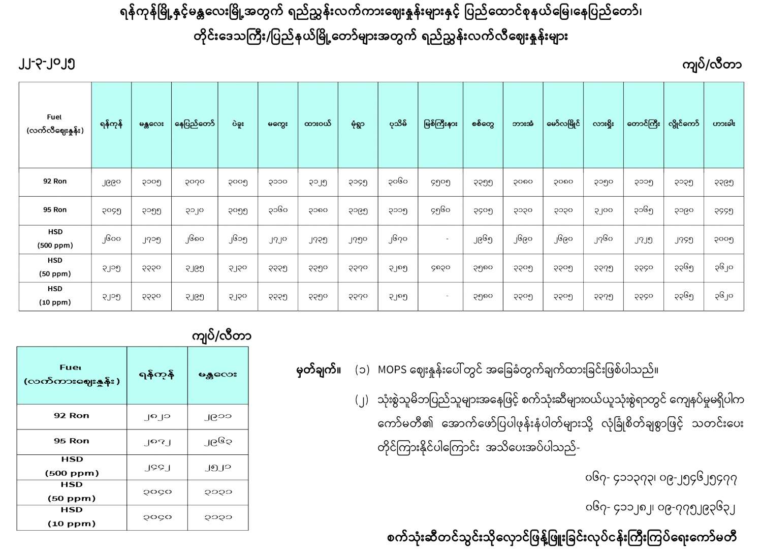 ရန်ကုန်မြို့နှင့် မန္တလေးမြို့အတွက် ရည်ညွှန်းလက်ကားဈေးနှုန်းများနှင့် ပြည်ထောင်စုနယ်မြေ နေပြည်တော်၊ တိုင်းဒေသကြီး/ပြည်နယ် မြို့တော်များအတွက် ရည်ညွှန်းလက်လီဈေးနှုန်းများ 03/22/2025