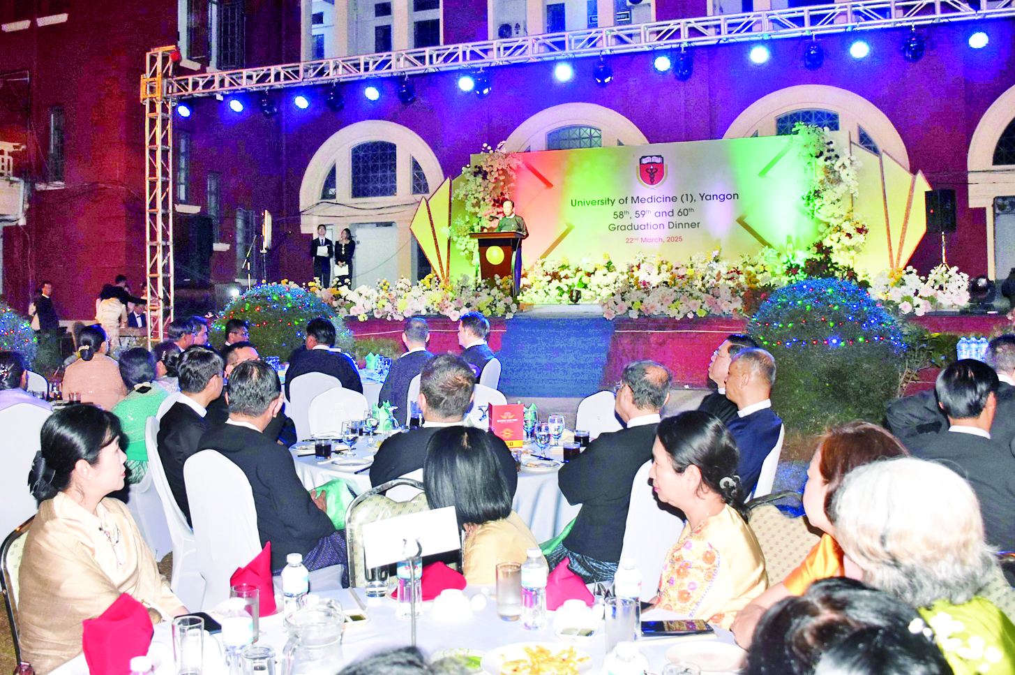 ကျန်းမာရေးဝန်ကြီးဌာန ကျန်းမာရေးလူ့စွမ်အားအရင်းအမြစ်ဦးစီးဌာန ဆေးတက္ကသိုလ်(၁) ရန်ကုန်၏ (၅၈)ကြိမ်၊ (၅၉)ကြိမ်နှင့်အကြိမ်(၆၀) မြောက်ဘွဲ့နှင်းသဘင်ဂုဏ်ပြုညစာစားပွဲကို ယမန်နေ့ညနေပိုင်းတွင် ဆေးတက္ကသိုလ်(၁) ရန်ကုန်၏မြက်ခင်းပြင်၌ ကျင်းပရာ ကျန်းမာရေးဝန်ကြီးဌာန ပြည်ထောင်စုဝန်ကြီးပါမောက္ခ ဒေါက်တာသက်ခိုင်ဝင်း၊ ရန်ကုန်တိုင်းဒေသကြီးဝန်ကြီးချုပ်နှင့်ဝန်ကြီးများ၊ ကျန်းမာရေးဝန်ကြီးဌာနမှ ညွှန်ကြားရေးမှူးချုပ်များ၊ ပါမောက္ခချုပ်များ၊ ဘွဲ့ရကျောင်းသား ကျောင်းသူများ၏ မိဘများ တက်ရောက်ကြသည်။