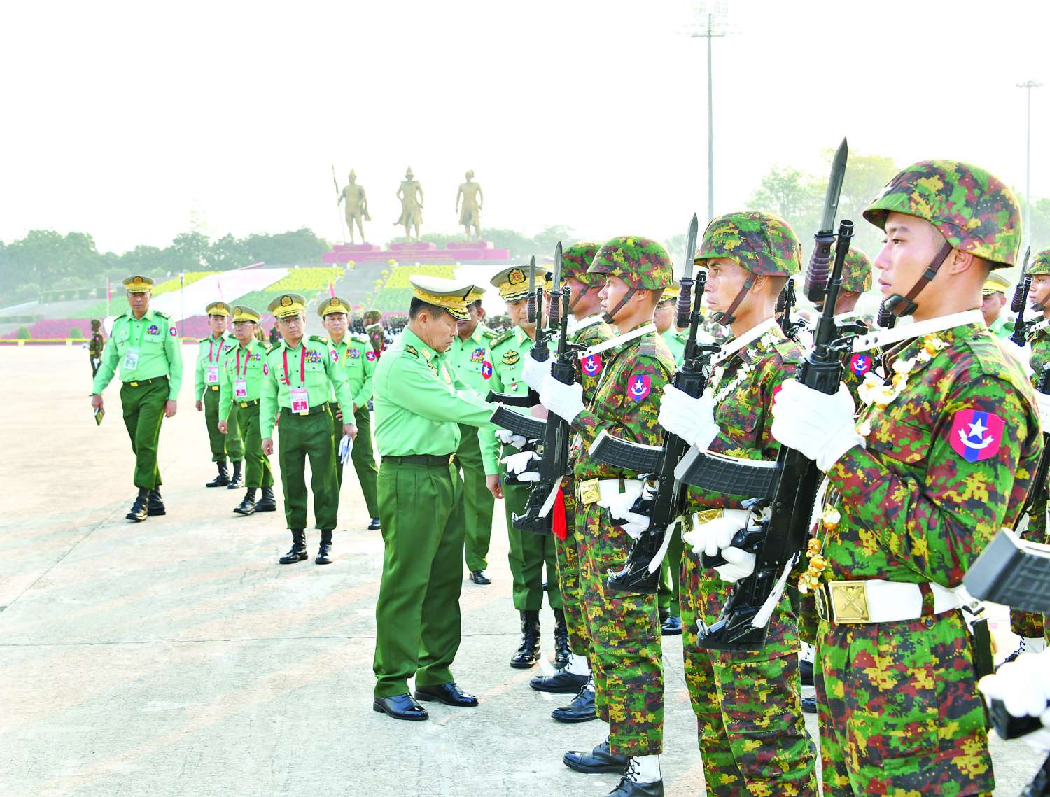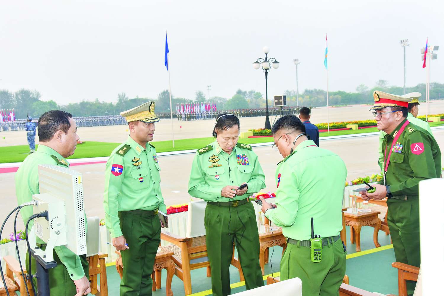 ဆက်လက်၍ နိုင်ငံတော်စီမံအုပ်ချုပ်ရေးကောင်စီ ဒုတိယဥက္ကဋ္ဌ၊ ဒုတိယတပ်မတော်ကာကွယ်ရေးဦးစီးချုပ် ကာကွယ်ရေးဦးစီးချုပ်(ကြည်း)နှင့် အဖွဲ့ဝင်များသည် တပ်မတော်လေမှ လေယာဉ်၊ ရဟတ်ယာဉ်များ၏ အချိန်ကိုက် အုပ်ဖွဲ့ပျံသန်းလေ့ကျင့်မှုများ၊ အလံတော်အဖွဲ့နှင့် စစ်ကြောင်းတပ်ခွဲများ၏ ဝတ်စားဆင်ယင်မှုဆိုင်ရာများ၊ စစ်ရေးပြအလံများ၊ စစ်ရေးပြလက်နက်ငယ်များနှင့် စစ်ဝတ်တန်ဆာများ ပြင်ဆင်ထားရှိမှုနှင့် စစ်ရေးပြတပ်ခွဲအသီးသီး၏ စစ်ရေးပြလှုပ်ရှားမှုများကို အသေးစိတ် လိုက်လံကြည့်ရှုစစ်ဆေးပြီး လိုအပ်သည်များကို တာဝန်ရှိသူများနှင့် ပေါင်းစပ်ညှိနှိုင်းဆောင်ရွက်ပေးသည်။