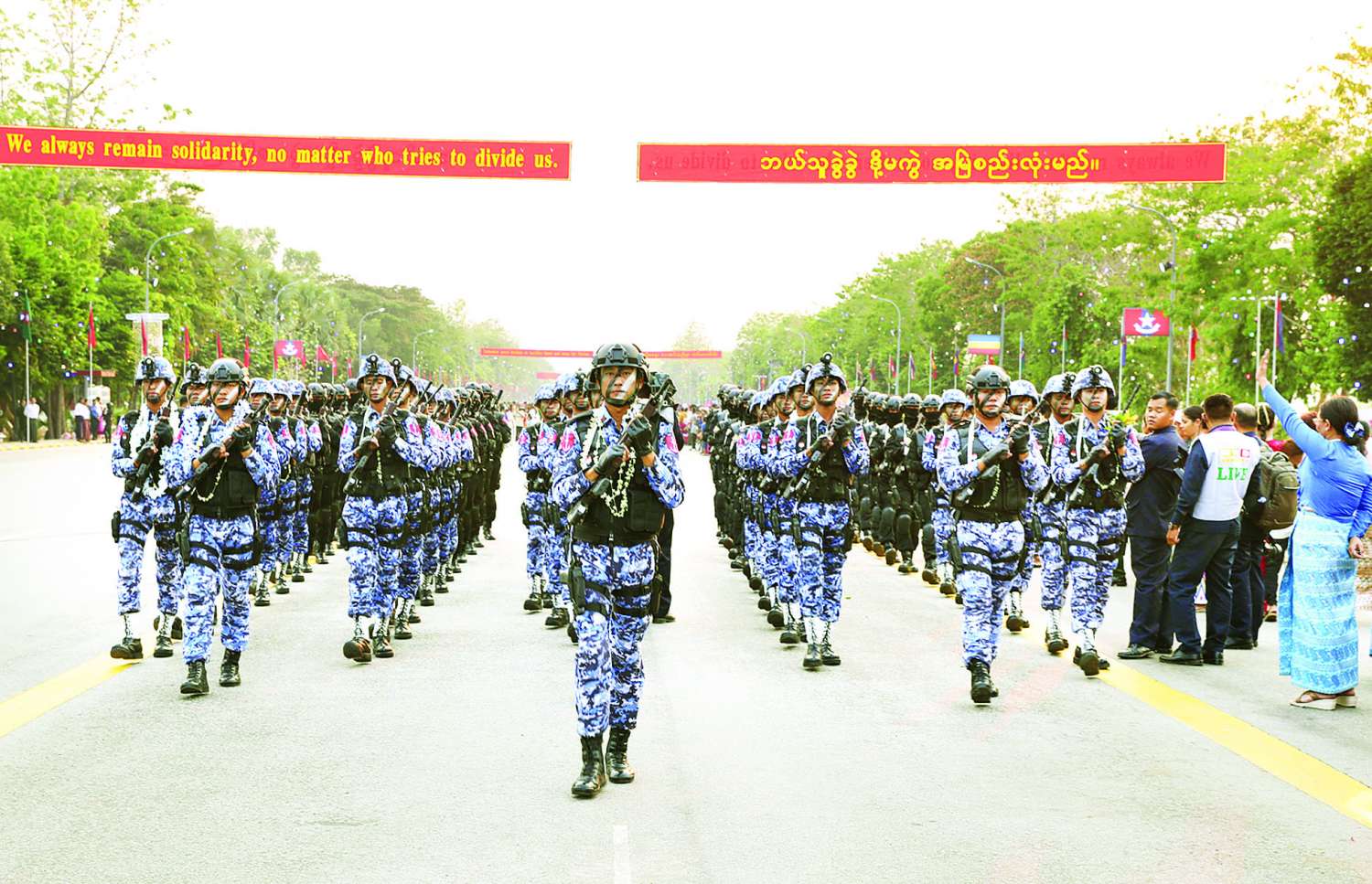 ယင်းနောက် နိုင်ငံတော်စီမံအုပ်ချုပ်ရေးကောင်စီဥက္ကဋ္ဌ တပ်မတော်ကာကွယ်ရေးဦးစီးချုပ် ဗိုလ်ချုပ်မှူးကြီး သတိုးမဟာသရေစည်သူ သတိုးသီရိသုဓမ္မ မင်းအောင်လှိုင်အား စစ်ရေးပြမှူးကြီး ဗိုလ်ချုပ် ရဲကျော်သူ ဦးဆောင်သော စစ်ကြောင်းကြီးများမှ တပ်မတော်သားများ၊ မြန်မာနိုင်ငံရဲတပ်ဖွဲ့ဝင်များက အစီအစဉ်အတိုင်း စစ်ကြောင်းပုံဖြင့် ညီညာစွာ ချီတက်အလေးပြုကြပြီး စစ်ရေးပြကွင်းကြီးအတွင်းမှ ပြန်လည်ထွက်ခွာကြသည်။