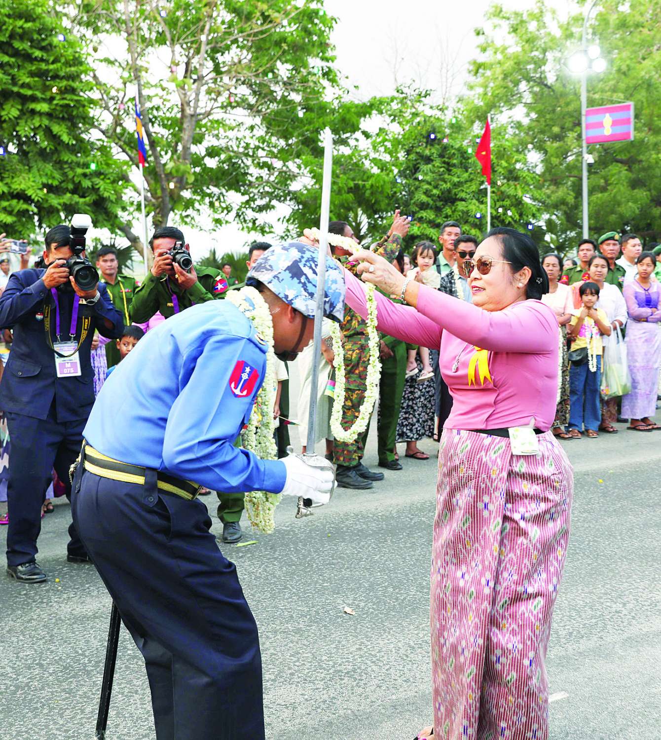 ထိုသို့ချီတက်ချိန်တွင် နိုင်ငံတော်စီမံအုပ်ချုပ်ရေးကောင်စီဥက္ကဋ္ဌ တပ်မတော် ကာကွယ်ရေးဦးစီးချုပ်၏ ဇနီး ဒေါ်ကြူကြူလှ၊ ကောင်စီဒုတိယဥက္ကဋ္ဌ ဒုတိယတပ်မတော် ကာကွယ်ရေးဦးစီးချုပ် ကာကွယ်ရေးဦးစီးချုပ်(ကြည်း)၏ဇနီး ဒေါ်သန်းသန်းနွယ်၊ ညှိနှိုင်းကွပ်ကဲရေးမှူး (ကြည်း၊ ရေ၊ လေ)၏ဇနီး၊ ကာကွယ်ရေးဦးစီးချုပ်(ရေ)၏ဇနီး၊ ကာကွယ်ရေးဦးစီးချုပ်(လေ)၏ဇနီး၊ ကာကွယ်ရေးဦးစီးချုပ်ရုံးမှ တပ်မတော်အရာရှိကြီးများ၏ ဇနီးများက ဂုဏ်ပြုပန်းကုံးများစွပ်၍ ကြိုဆိုကြသည်။ အလားတူ ကာကွယ်ရေးဦးစီးချုပ်ရုံး(ကြည်း)မှ အရာရှိ၊ စစ်သည်မိသားစုများ၊ နေပြည်တော်တိုင်းစစ်ဌာနချုပ်နှင့် တပ်နယ်အသီးသီးတို့မှ အရာရှိ၊ စစ်သည်၊ မိသားစုများ၊ မြန်မာနိုင်ငံရဲတပ်ဖွဲ့ဝင်များနှင့် မိသားစုများ၊ ဝန်ကြီးဌာနအသီးသီးမှ နိုင်ငံ့ဝန်ထမ်းများ၊ ရုပ်ရှင်ဂီတအနုပညာရှင်များ၊ ဒေသခံမိဘပြည်သူများကလည်း စစ်ကြောင်းကြီးများ ချီတက်ရာလမ်းတစ်လျှောက် သောင်းသောင်းဖြဖြကြိုဆိုကာ ဂုဏ်ပြုပန်းကုံးများစွပ်၍ ကြိုဆိုခဲ့ကြပြီး စစ်ကြောင်းကြီးများမှ တပ်မတော်သားများနှင့် မြန်မာနိုင်ငံရဲတပ်ဖွဲ့ဝင်များသည် ဇာတိသွေး၊ ဇာတိမာန်အပြည့်ဖြင့် စစ်ချီတေးများကို သံပြိုင်ဟစ်ကြွေးသီဆိုချီတက်လာကြပြီး စစ်ရေးပြကွင်းအတွင်းသို့ ရောက်ရှိနေရာယူကြသည်။