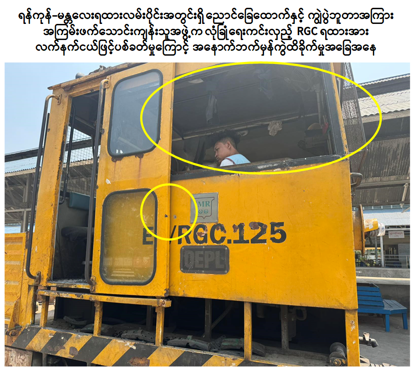 ယနေ့ ဖြူး- တောင်ငူလမ်းပိုင်း လုံခြုံရေးစစ်ဆေးသည့် RGC-125 သည် ညောင်ခြေထောက်ဘူတာမှ နံနက် ၇ နာရီ ၃၆ မိနစ် ထွက်ခွာလာပြီး ညောင်ခြေထောက်နှင့် ကျွဲပွဲဘူတာအကြား မိုင် ၁၄၄/၁၀-၁၁ ခန့်အရောက် နံနက် ၇ နာရီ ၅၀ မိနစ်တွင် သံလမ်းအနောက်ဘက် ရန်ကုန်-မန္တလေးကားလမ်းဘက်မှ လက်နက်ငယ်ဖြင့် ပစ်ခတ်သဖြင့် RGC 125 စက်ခေါင်း၏ အနောက်ဖက်မှန်တစ်ချပ်ကွဲပြီး အနောက်ဖက်သံဘောင်တွင် ကျဉ်ထိမှန်ခဲ့ကြောင်းနှင့် အဆိုပါပစ်ခတ်မှုကြောင့် စက်ခေါင်းမောင်းနှင့် လုံခြုံရေးတပ်ဖွဲ့များ ထိခိုက်မှုမရှိကြောင်း သတင်းရရှိသည်။